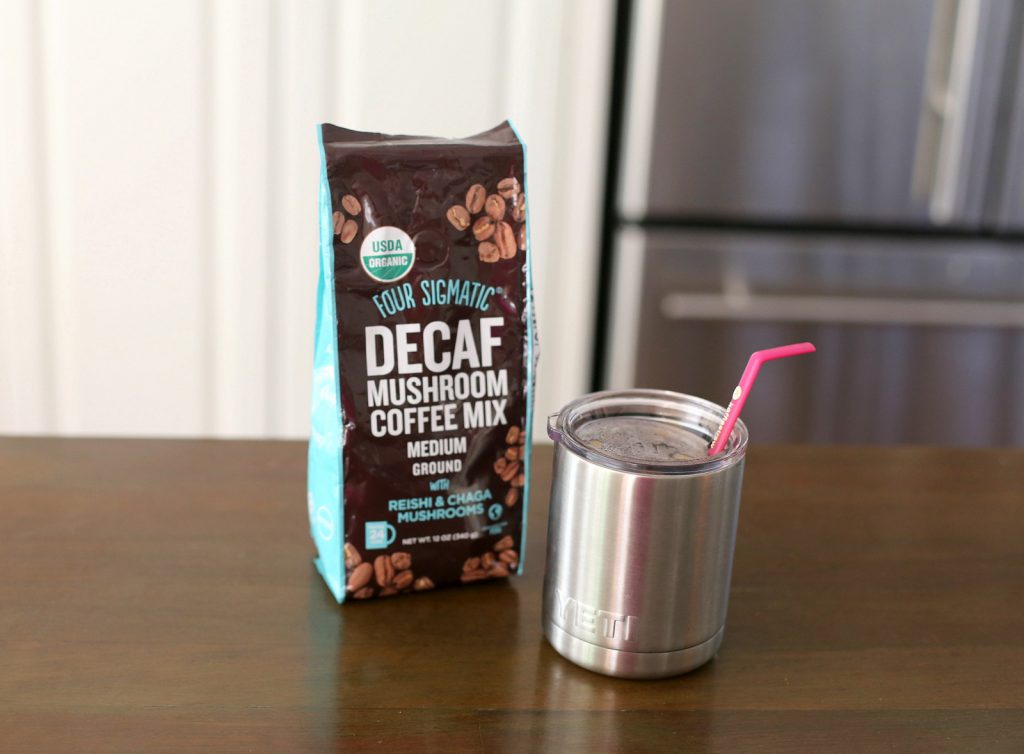 I will absolutely still have regular coffee when I want it but figured it might be smart to switch to decaf here and there to hopefully decrease my dependence on caffeine. I immediately remembered my friend Gina raving about Four Sigmatic’s organic mushroom coffee and, particularly, their decaf blend. I texted her about it and then it didn’t take me long to place an order for my first bag!