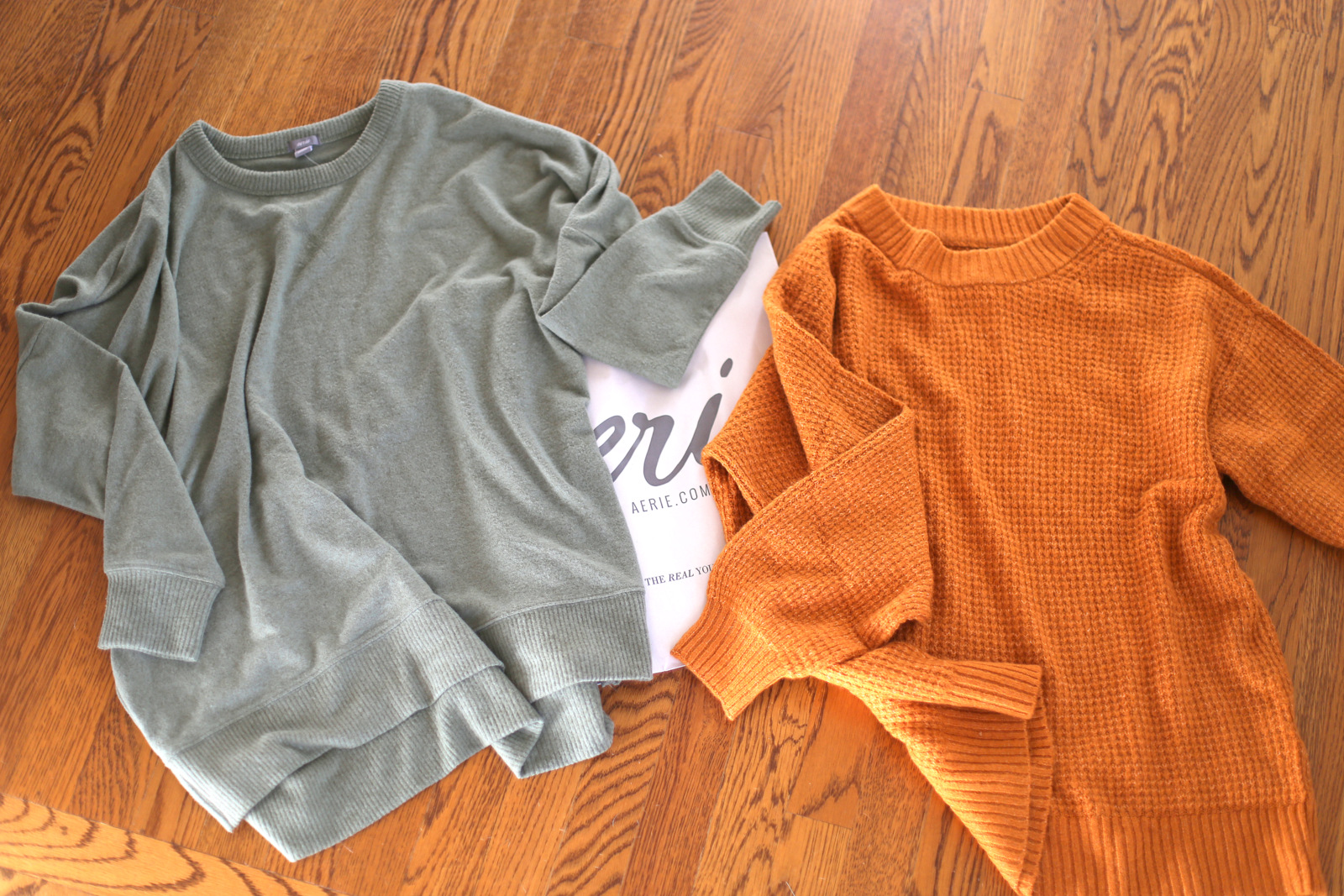 Chalk one up to Instagram targeted marketing! I had an ad for American Eagle sweaters and thermal tops pop up as I was scrolling through Instagram earlier this week and thought everything looked so darn cute that I was inspired to pop into the store late yesterday morning when I was making a return at a nearby shop. Ryder slept through my fashion show (Chase was at preschool) which worked perfectly because I was able to try on a bunch of different tops and was very impressed with both the flattering fit and the comfort of most things I tried on.