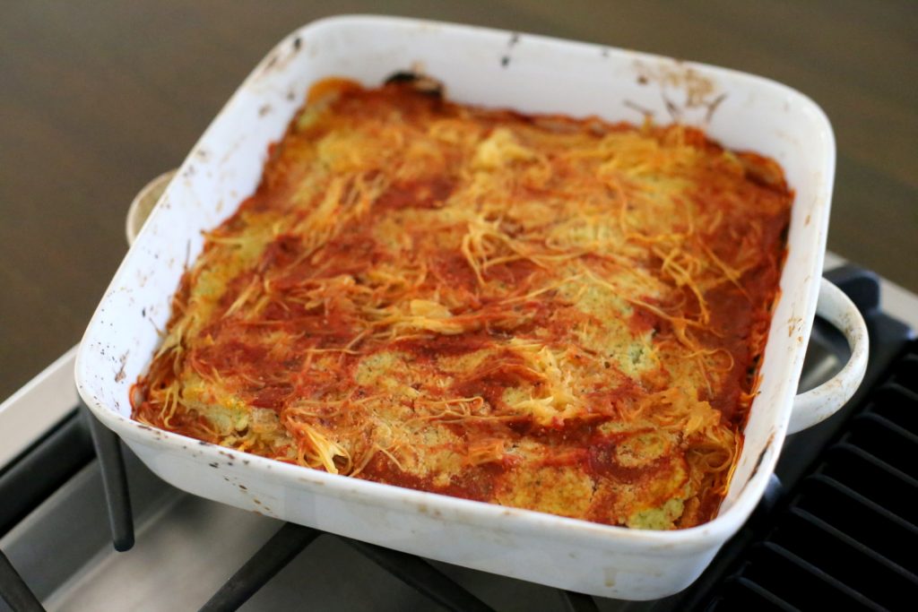 Prior to my parents’ visit last weekend, I did a little digging and tried to find some new plant-based recipes to try since my mom and dad are currently sticking to a mostly plant-based diet at the moment. I stumbled upon a recipe for vegan spaghetti squash lasagna and was instantly intrigued by the faux-ricotta cheese made with soaked almonds, fresh basil, pressed tofu, lemon juice and spices. It was pretty easy to assemble and we all really liked the recipe. One tip if you make it: Serve it in bowls and stir everything up to maximize the faux-ricotta mixture in every bite!