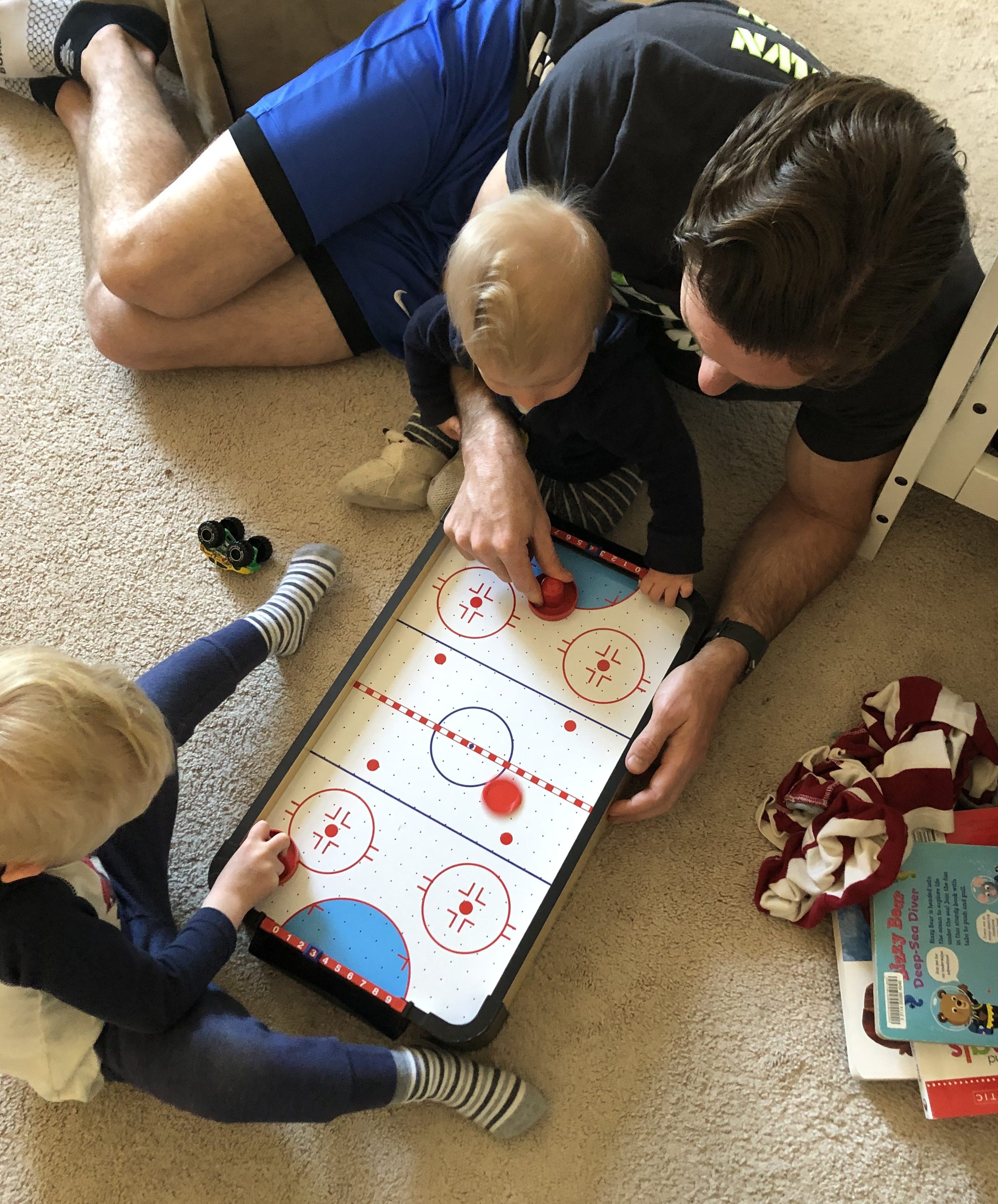 Santa (aka Ryan) bought this mini air hockey table for Chase for Christmas and it’s one of those random gifts that surprised us by being a big-time hit. Chase loves it and is getting surprisingly good at it already! He loves challenging us to games and I have visions of Chase and Ryder playing together in the future one day, too. I just wanted to share this here in case you’re on the lookout for a different kind of Easter or birthday surprise for a little one in your life!