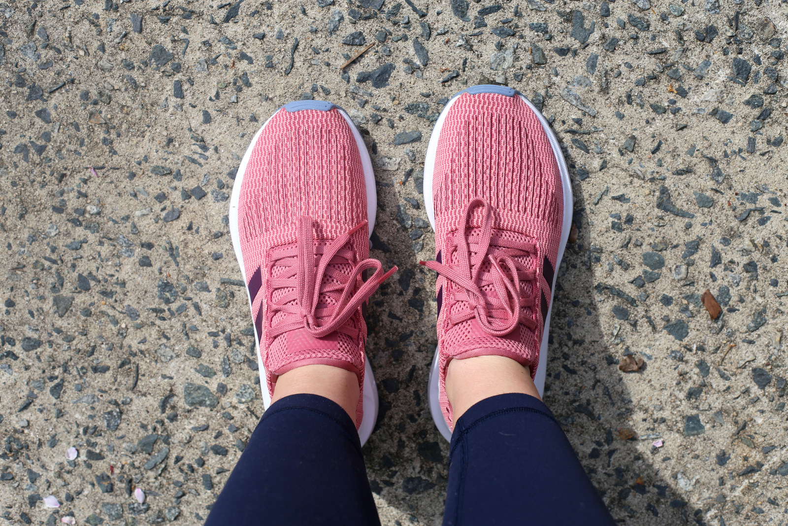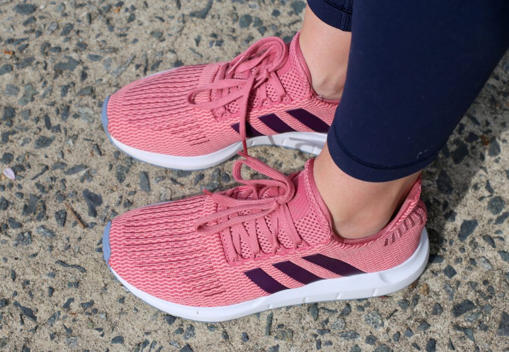 The tracking that goes on behind the scenes of the internet is bad news for my wallet. After three days of seeing this pair of Adidas sneakers pop up in ads on my computer and my phone, I pulled the plug and bought them. No regrets! I knew I’d love them since I already have the olive green version of the same sneakers (Adidas Swift Run) and I’m a big-time fan of the rose pink color and deep purple detailing. I haven’t had pink sneakers in years and I’m all about it especially since the color seems very spring-appropriate right now! Plus, they were on clearance and it’s hard to beat brand new Adidas sneakers for only $42! (Note: If these sneakers caught your eye, order them in at least 1/2 size down from your usual sneaker size!)