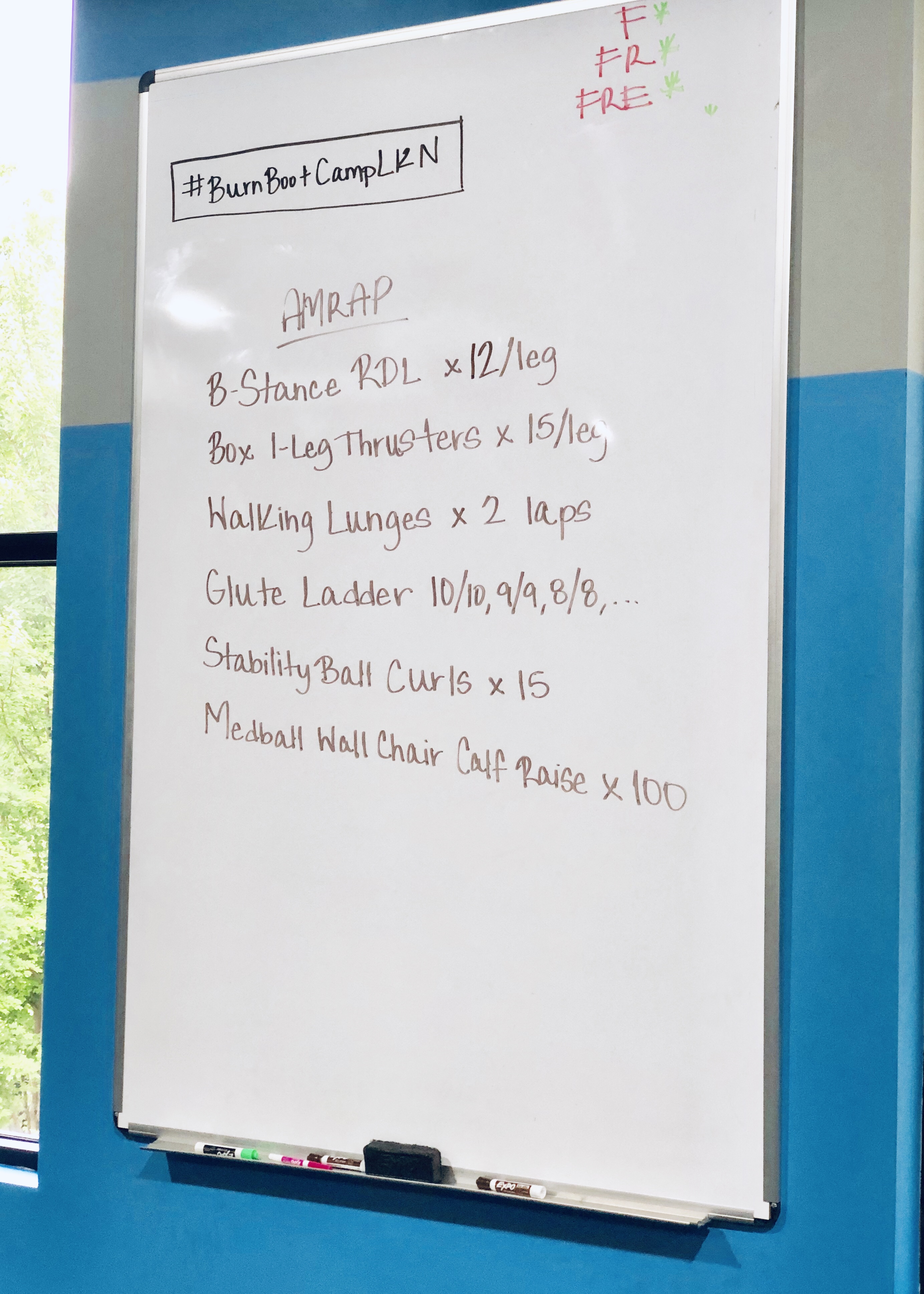 Yesterday’s Burn Boot Camp leg day workout was a good one! It was an AMRAP white board workout meaning you went through as many rounds of the workout as possible in the allotted time (I got through two rounds) and my glutes, quads and hamstrings definitely felt the burn. Here are links to the exercises (+ a little more detail on the workout) if you’d like to give them a try: B-Stance RDL / Box 1-Leg Thrusters / Walking Lunges (with a pause to pulse three times at the bottom of the lunge) / Glute Ladder: Pair 10 reps of Banded Glute Raises with 10 reps of Banded Bridge Press Outs then 9 of each, 8 of each… / Stability Ball Curls / Medicine Ball Wall Sit with Calf Raise (squeeze medicine ball between your knees in the wall sit position and complete calf raises in this position)