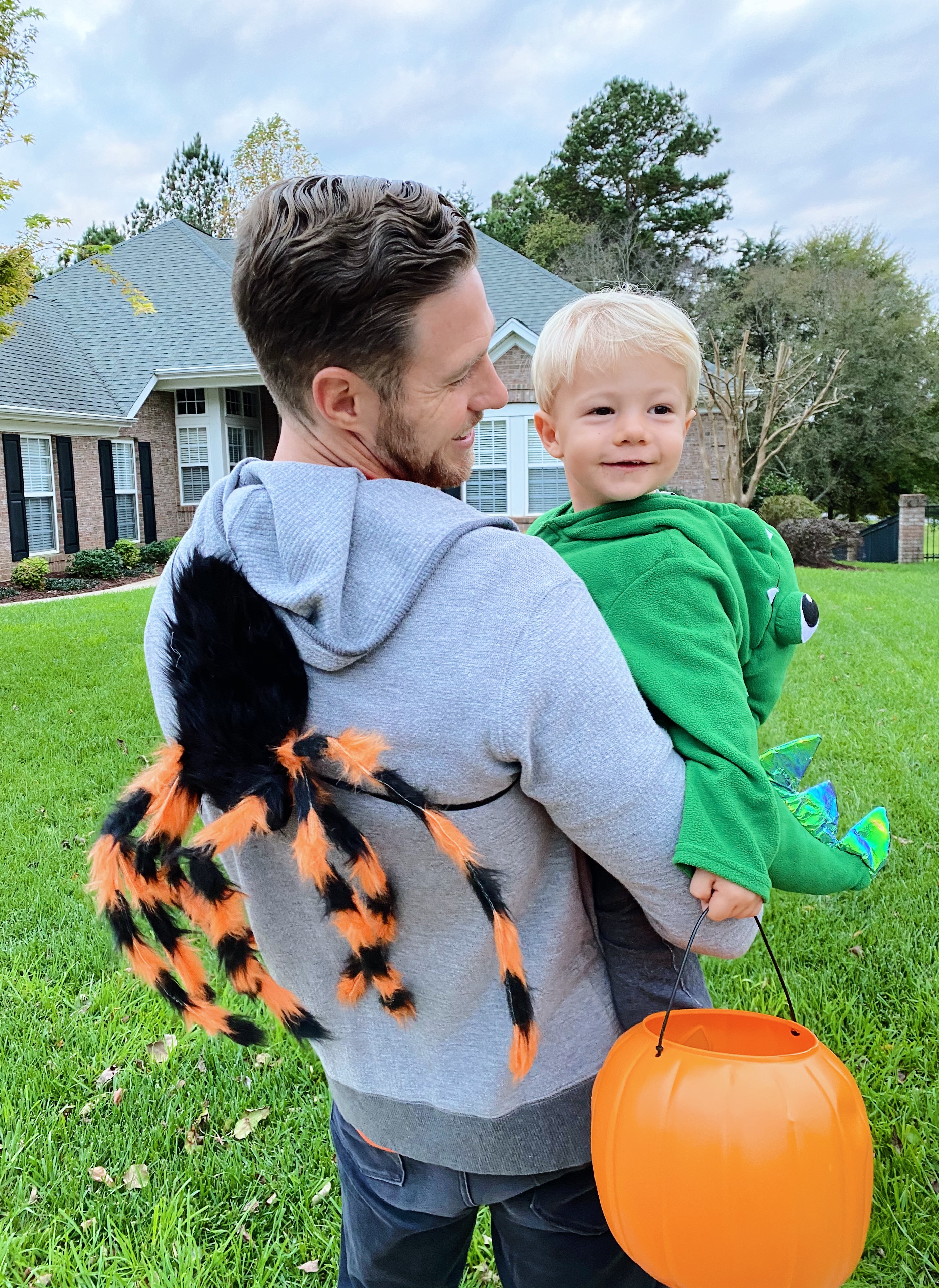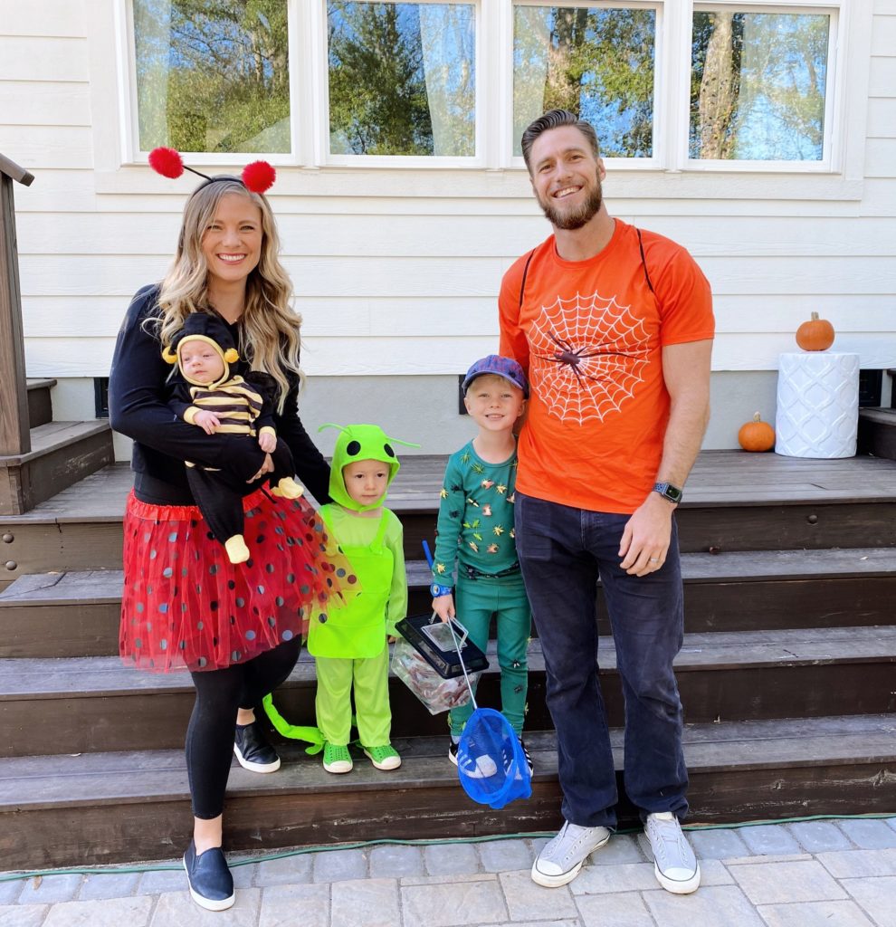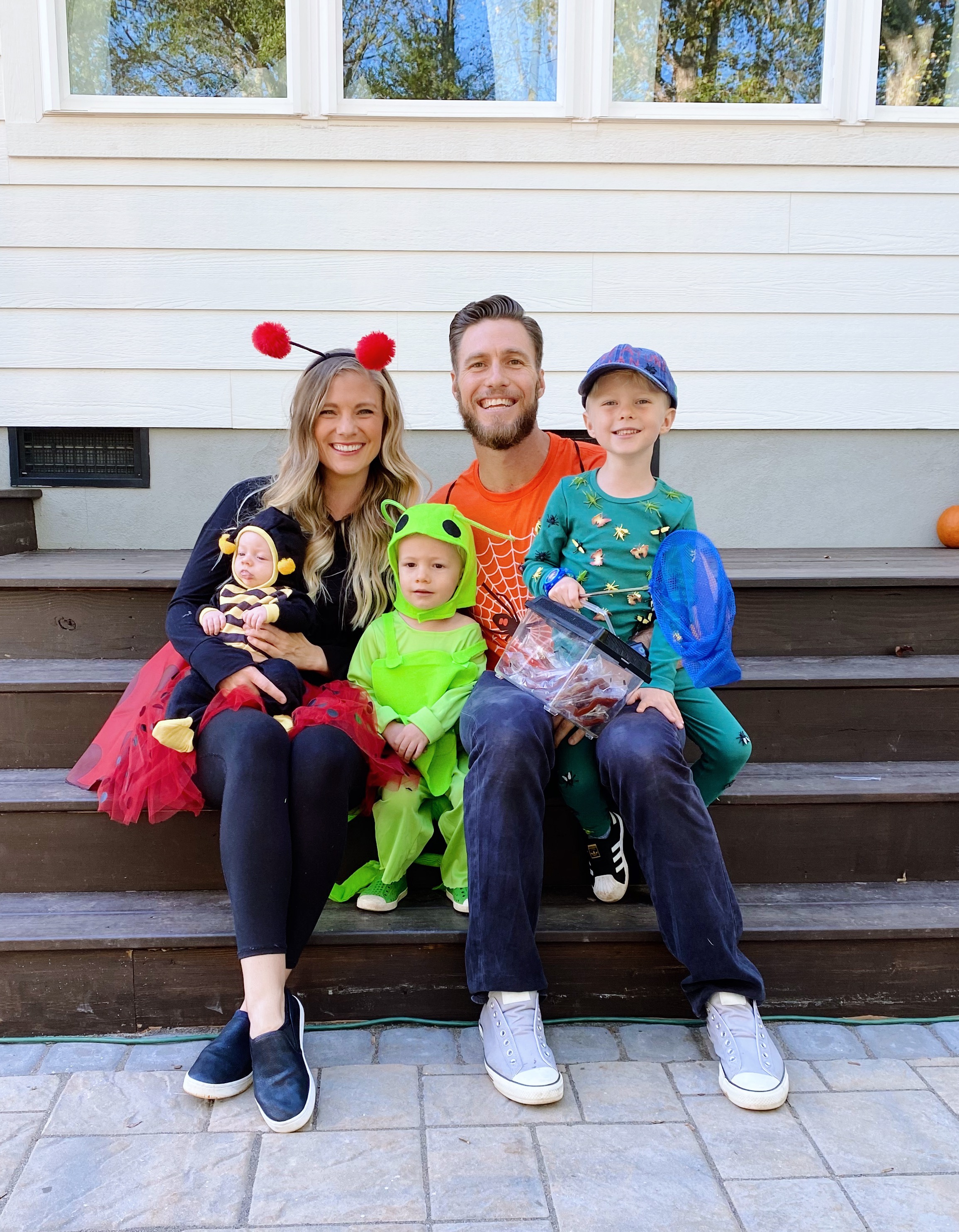 Early in October, Chase said he wanted to be “Creature Man” for Halloween and when I asked him what Creature Man looks like, he shared that he has a special outfit with pretend bugs all over it so we did our best to recreate it. (I say “we” but all the credit goes to my mom who sewed the little bugs I bought off Amazon onto a set of green pajamas. We then filled one of his creature cages with gummy earthworms!) Chase’s desire to be Creature Man inspired the rest of our family’s costumes and we all went as a band of bugs! Ryder was a grasshopper (he LOVED his costume!), Rhett was a little bumblebee, I was a ladybug and Ryan was a spider!