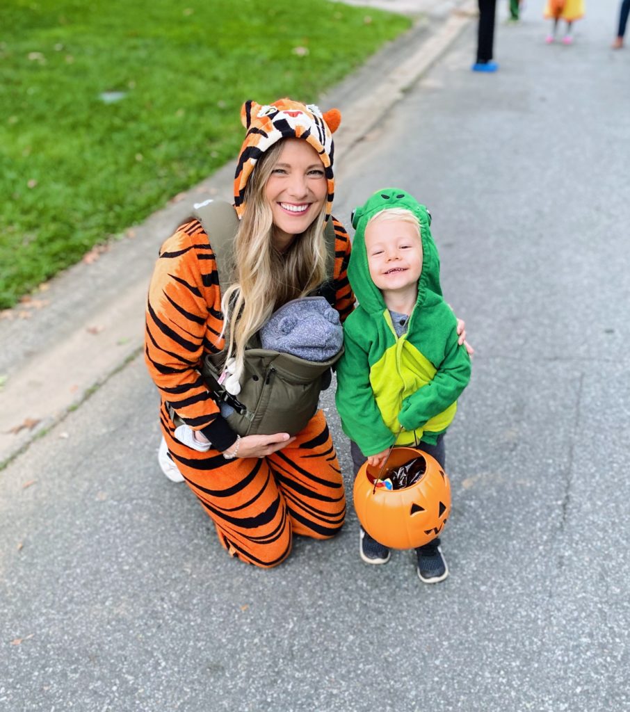 On Halloween night, the weather took a turn and ended up being chilly so the boys super-thin bug costumes would’ve been covered by jackets. We gave them the option to pick random costumes from our costume bin and Chase and Ryder decided to be dragons for Halloween: Round 2! (Rhett sported a pumpkin shirt, I wore the tiger onesie I bought for Ryan’s work holiday party last year and Ryan was a spider again.)