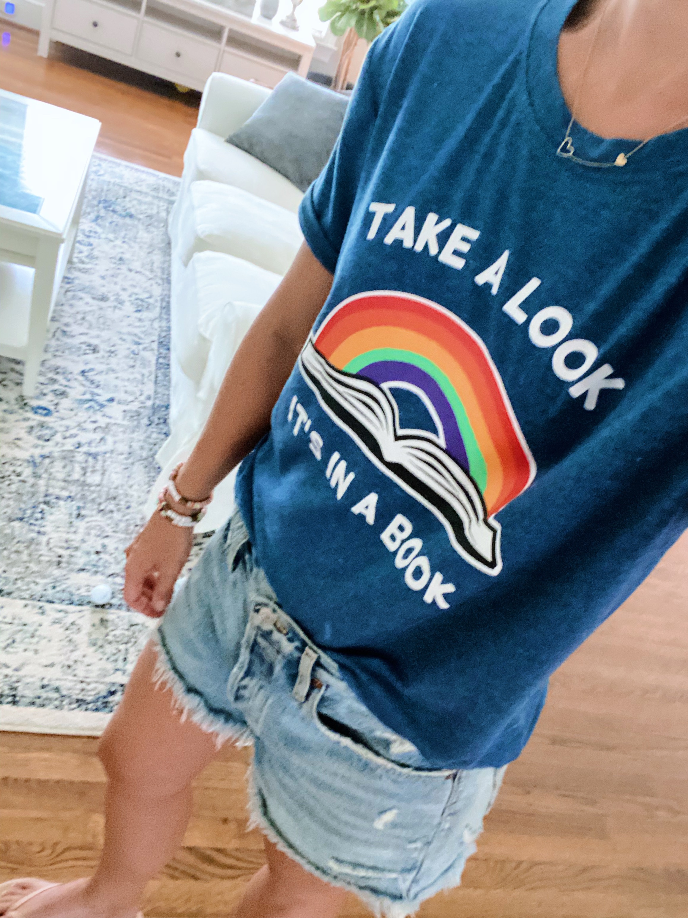 Any other Reading Rainbow fans out there? A couple of weeks ago, I shared an IG Story featuring the theme song from Reading Rainbow and someone sent me a DM with a link to this Take A Look It’s In a Book t-shirt. I bought it the second I clicked the link! I love the look of graphic tees but always struggle with which one to buy because so many of the designs just don’t call to me. You better believe this one did and my book-loving heart had to have it. It’s also been a fun one to wear out and about because inevitably a stranger will comment on it, proving Reading Rainbow had an amazing reach back in the day! And yes, yes I did wear this t-shirt during a trip to the library earlier this week. While that wasn’t planned, let’s just call it a happy coincidence.
