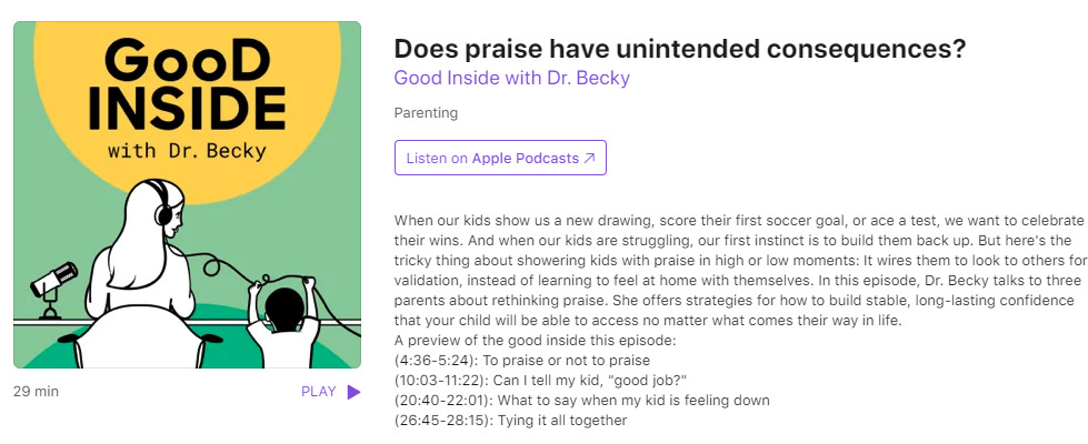 Dr. Becky encouraged listeners to consider asking children questions about something during their high moments versus immediately saying “good job,” and highlighted the fact that “good job” is essentially a conversation ender. As an adult, if you just spent months redecorating your living room and your best friend comes over and says “good job” there’s not much else to say other than “thanks.” If, on the other hand, your friend begins enthusiastically asking questions about how you chose the new paint color or where you got your new chair cushions, you’re much more likely to feel an internal sense of pride for your work and think through how you made the decisions you did that resulted in the hard work you’re proud of yourself for completing.