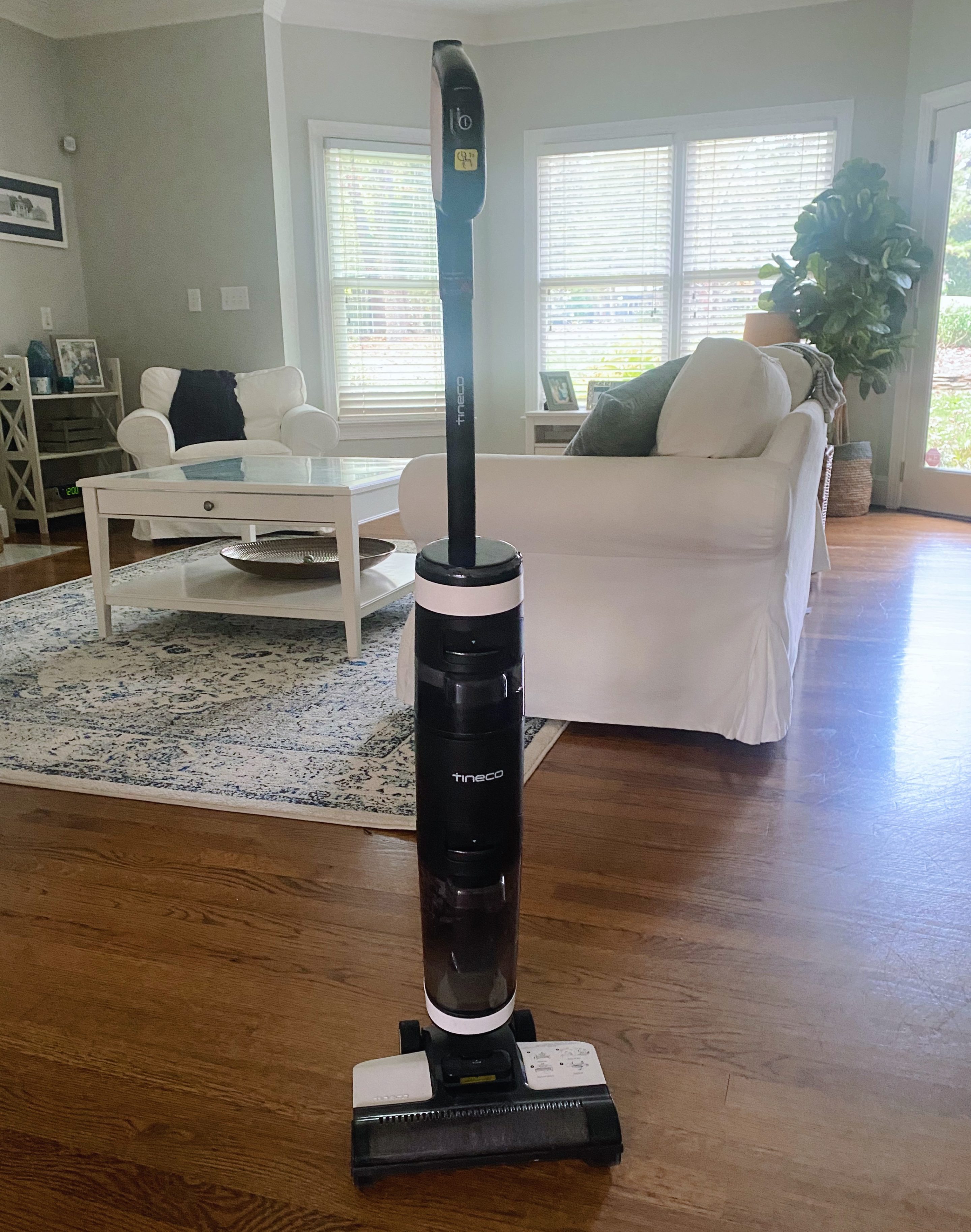 I owe my mother-in-law a huge thanks for putting the Tineco wet-dry vacuum on our radar. During her last visit, she raved about her Tineco vacuum and said it did the most amazing job keeping her tile floors clean with ONLY water. (A cleaning solution may also be used if you prefer.) What!? Life with three boys means our hardwood floors are always a gigantic mess, so I perked right up when she started talking about the Tineco vacuum‘s ability to both vacuum and mop simultaneously and every single question I threw at her came with the exact answer I wanted to hear. Is it cordless? Yes. Does it run for a long time? Yes. (I’ve never had it run out of a charge for me when using it downstairs which is the only place we have hardwood floors in our house.) Does it leave your floors soaking wet after use? No. Floors are nearly dry after use. Is it hard to push? No. It’s super smooth and self-propelled. Is it easy to empty and clean? Yes. As she talked, Ryan looked it up on Amazon and ordered it by the end of the night.