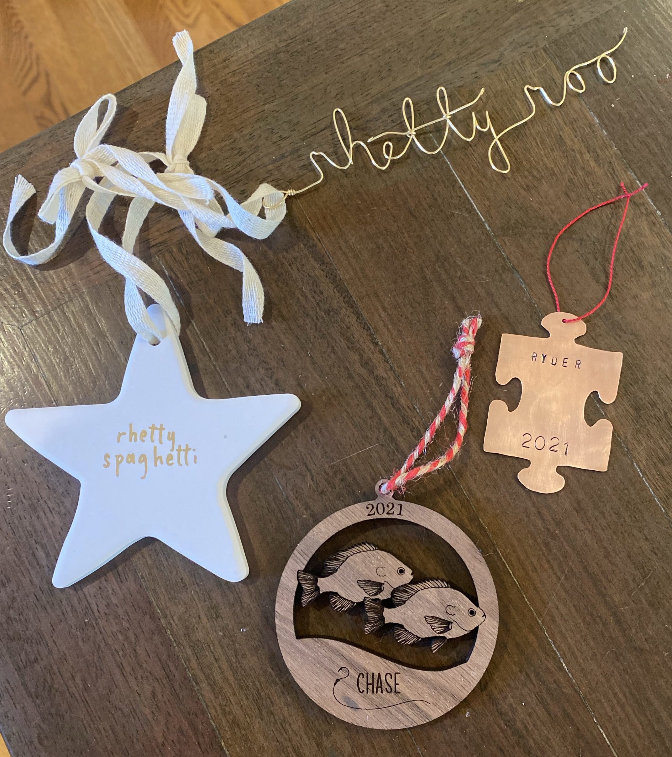 For our little Rhett man, I couldn’t resist a double-sided ornament featuring the two nicknames we call him on repeat in this house: Rhetty Roo and Rhetty Spaghetti! After a small error with our first order, the shop owner was so incredibly kind and quickly shipped out a replacement along with a gold wire name ornament. I love them both so much!
