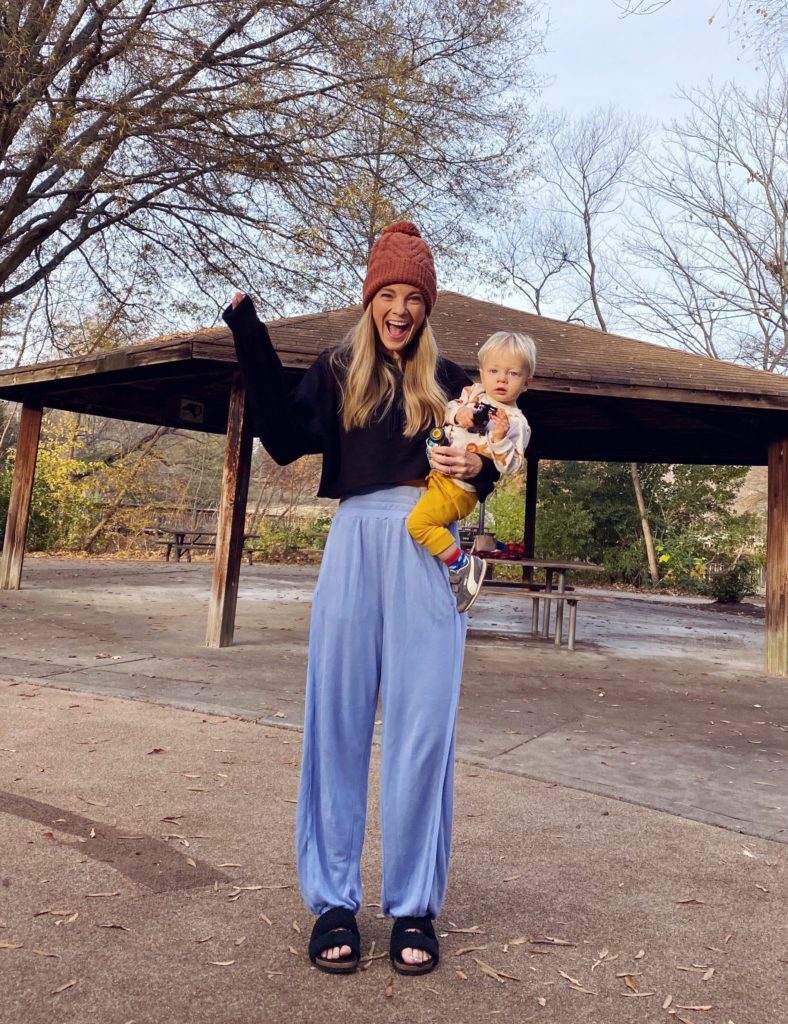 (Cropped Hoodie: BP / Joggers: Free People / Sherpa Slides: Old Navy / Beanie: Universal Thread via Target but from last year // Picture credit goes to Ryder man!)