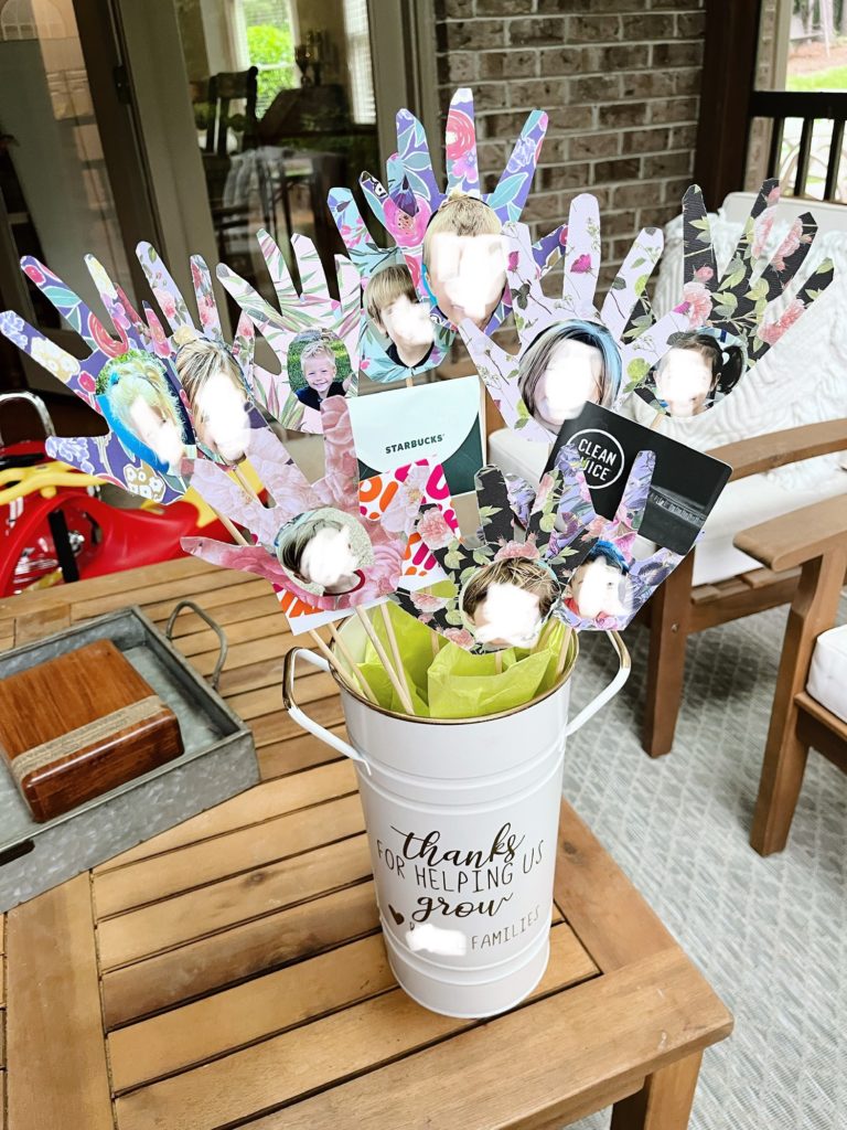 First, this gift card bouquet was a major hit! I simply cut out handprints on floral cardstock and then used double-sided tape to attach pics of all the kids in Ryder’s class to the handprints. We filled a personalized vase with the handprint bouquet and added in a bunch of gift cards (Clean Juice, Starbucks, Dunkin’ Donuts and Amazon which I added after I snapped this pic). For what it’s worth, I heard from a good number of teachers on Instagram who said they would love to receive something like this — gift cards seem like they are always, always a good way to go!