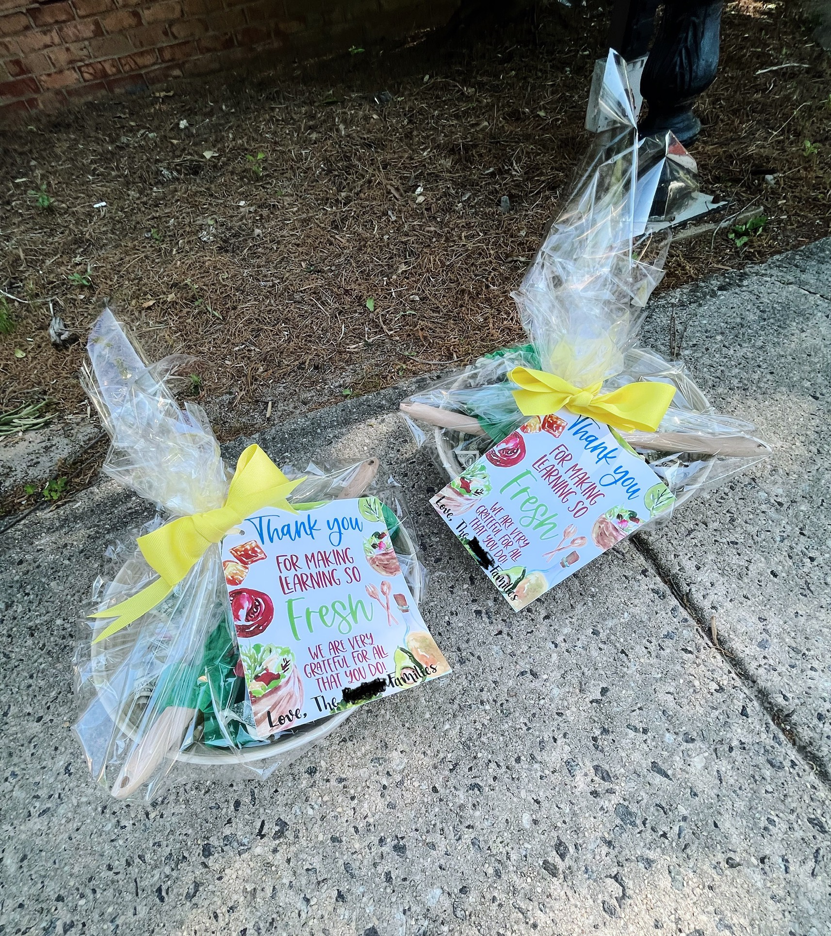Yesterday the teachers received a “money salad” and salad bowls were filled with crumbled up money as “lettuce” and filled with salad spoons and gift cards. The little graphics attached to the top of the salad bowls were printables from Etsy!