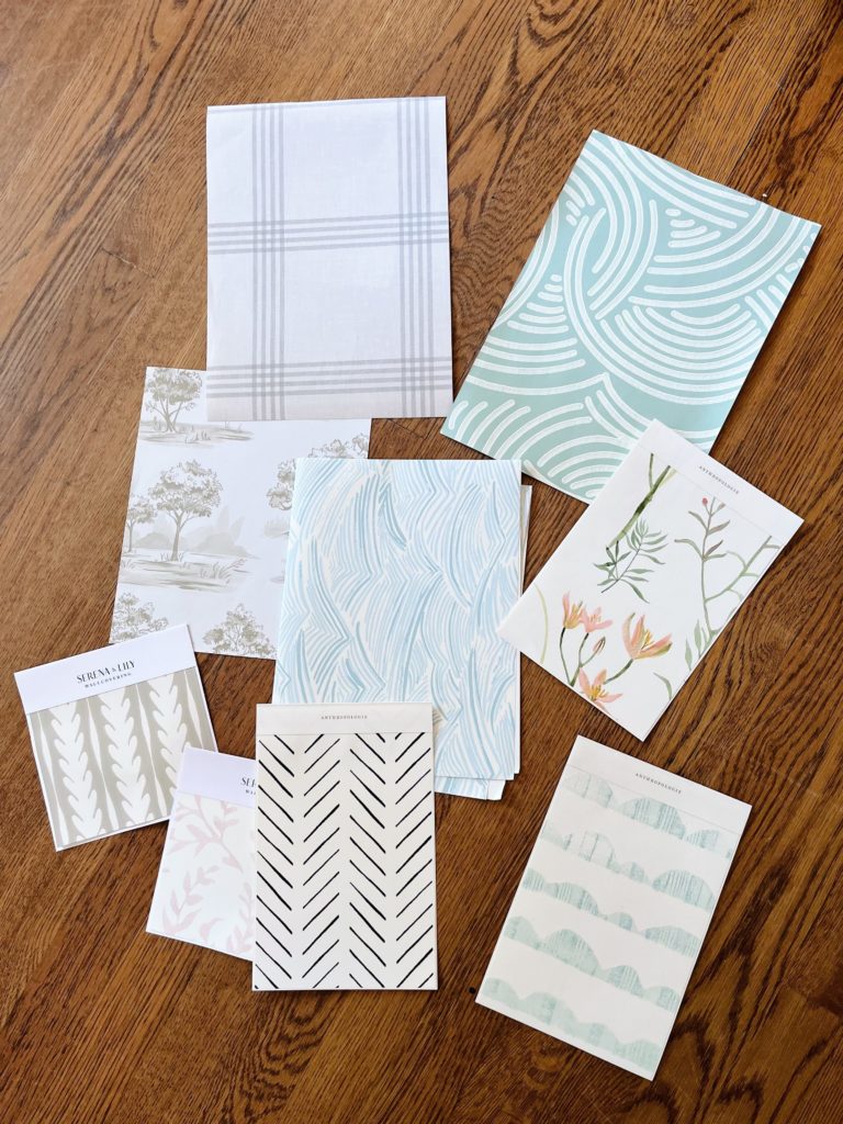 A bunch of wallpaper samples arrived for the new house! To quote Ryan when he saw them, “Are we wallpapering the whole house?” No, no we are not but I looove fun wallpaper accents, so I selected some samples to consider for a few spaces. I’m SO glad I ordered samples because the colors of a few of them looked significantly different in person than they did online. See below for our top contenders!