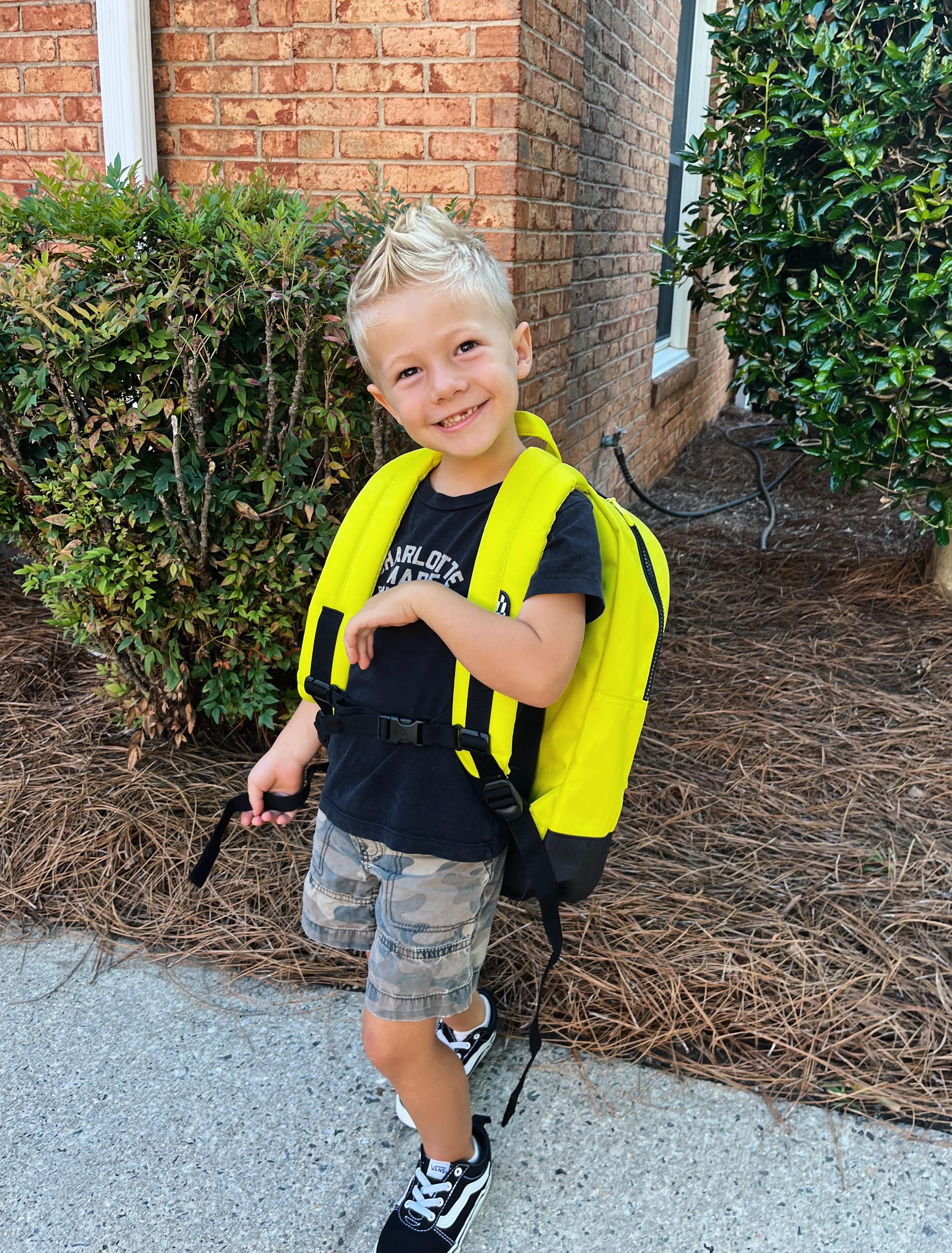 (Backpack: Herschel Supply — I swear by this brand for our big kids’ backpacks. Great quality! / Shirt: 704 Shop / Shorts: Hand-me-downs from Chase / Shoes: Vans slip-ons — gifted)