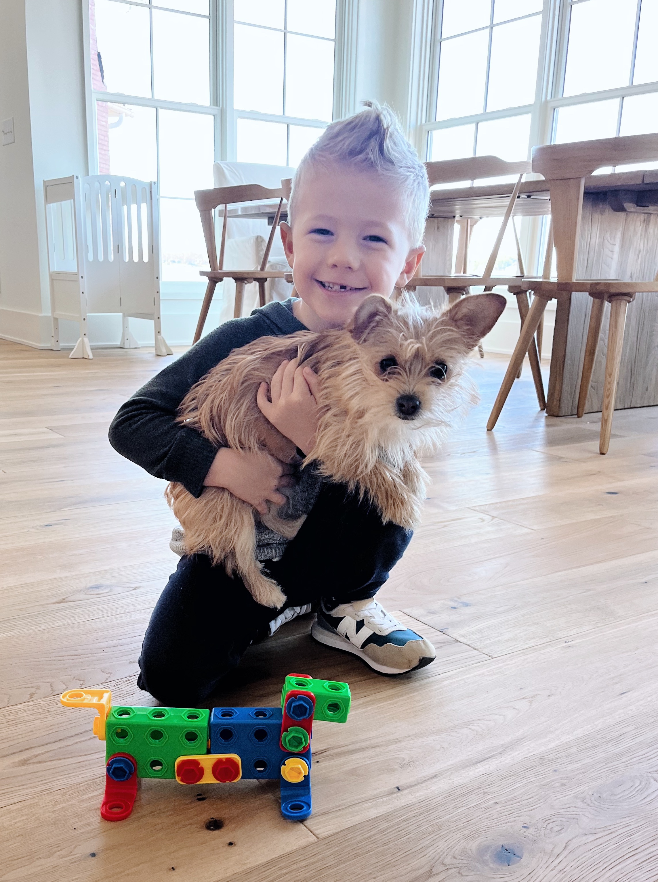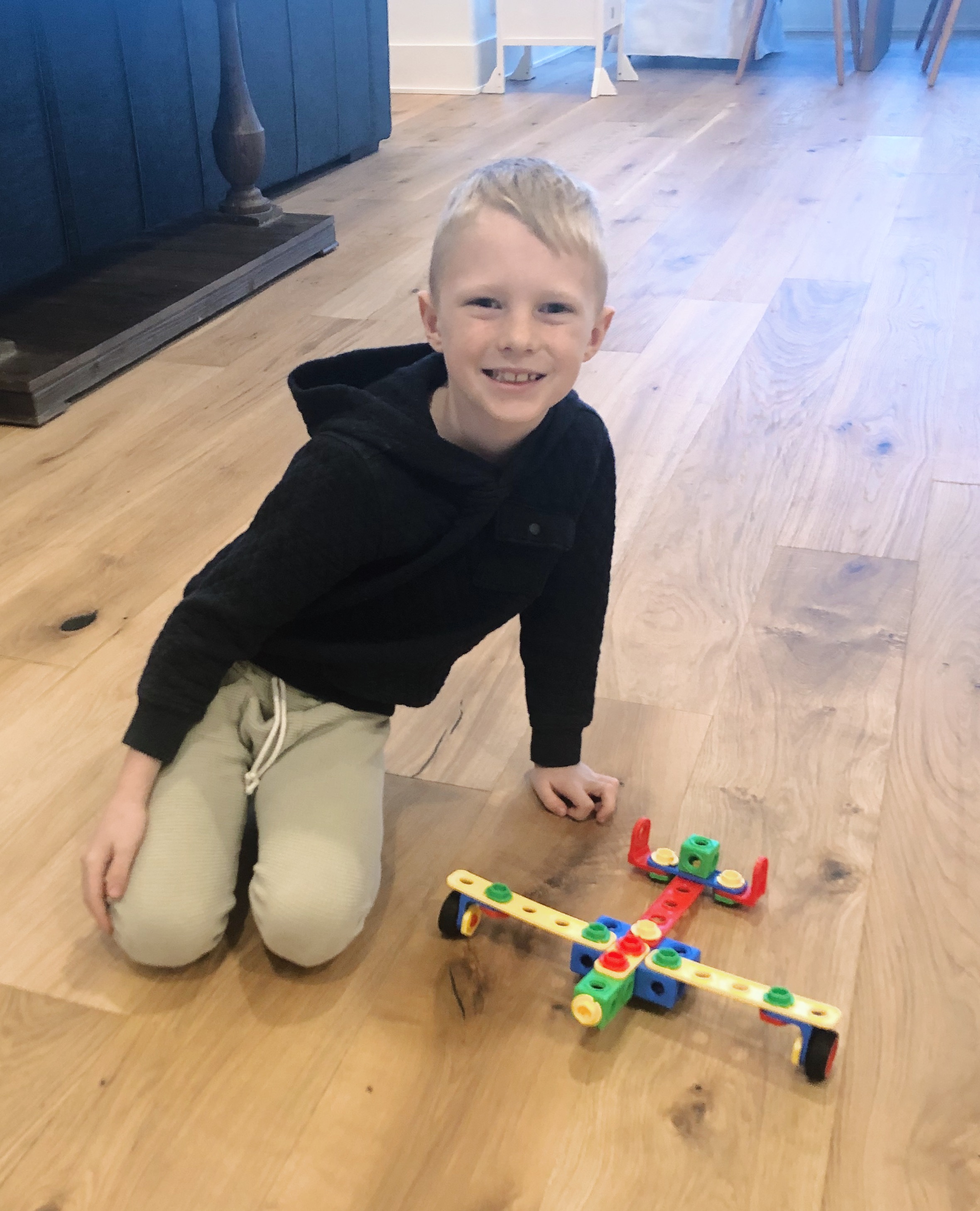 We’ve had Brickyard Building Blocks for the boys for years (a gift from our friend Pete!) and while our boys have always enjoyed playing with them, lately their interest has skyrocketed ever since we found the inspiration booklet for the blocks during our move. They’ve previously enjoyed coming up with their own creations (usually some kind of a car) but now that they have inspiration pictures to follow, they’ve been passionately creating robots, dogs, airplanes, motorcycles and more. Ryder has always been super into puzzles and building and this almost seems like a 3-D puzzle to him! Chase loves creating new things he can incorporate into imaginative play so they’ve been a huge hit for him as well. I just love it when something old starts to feel new again!