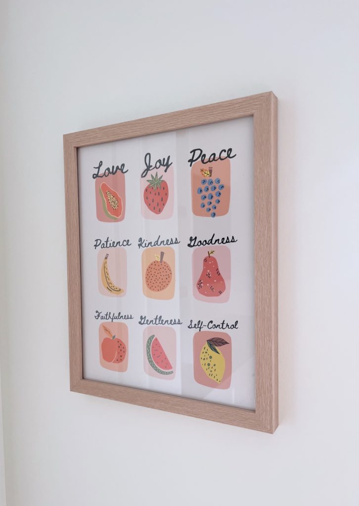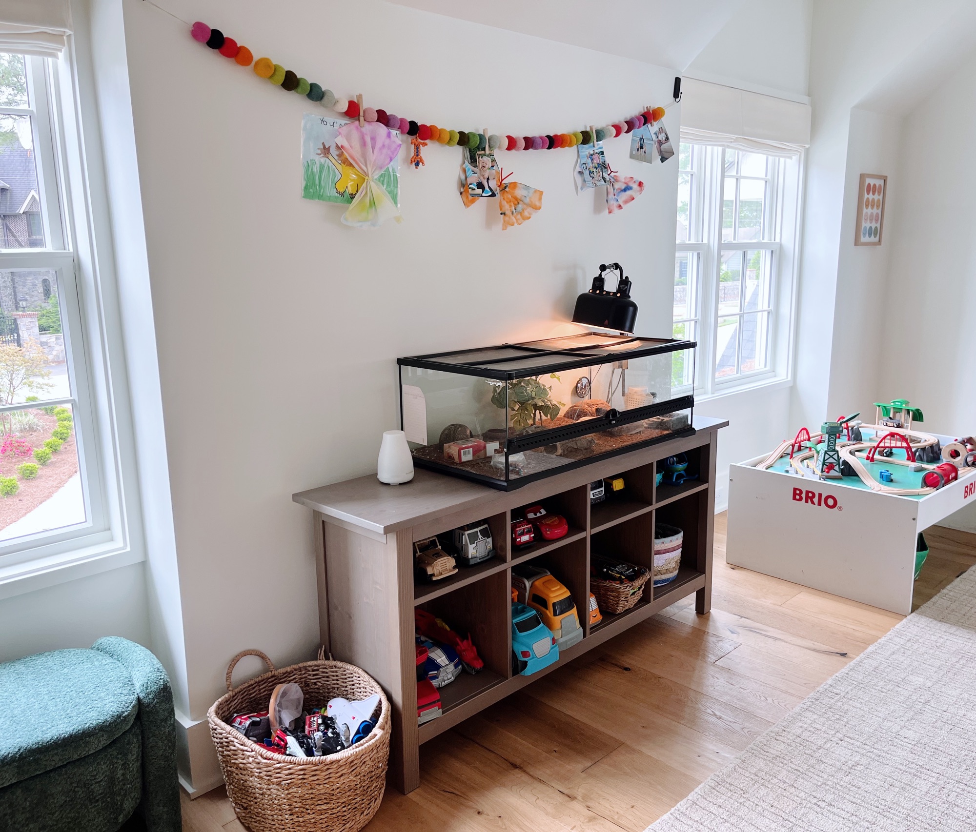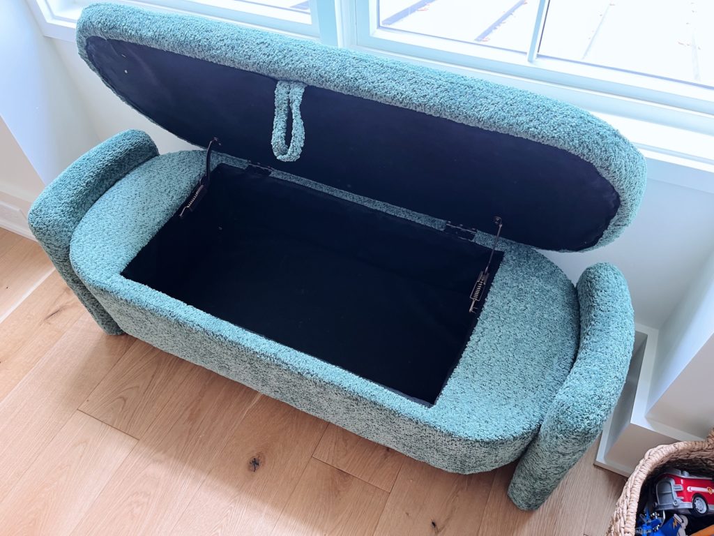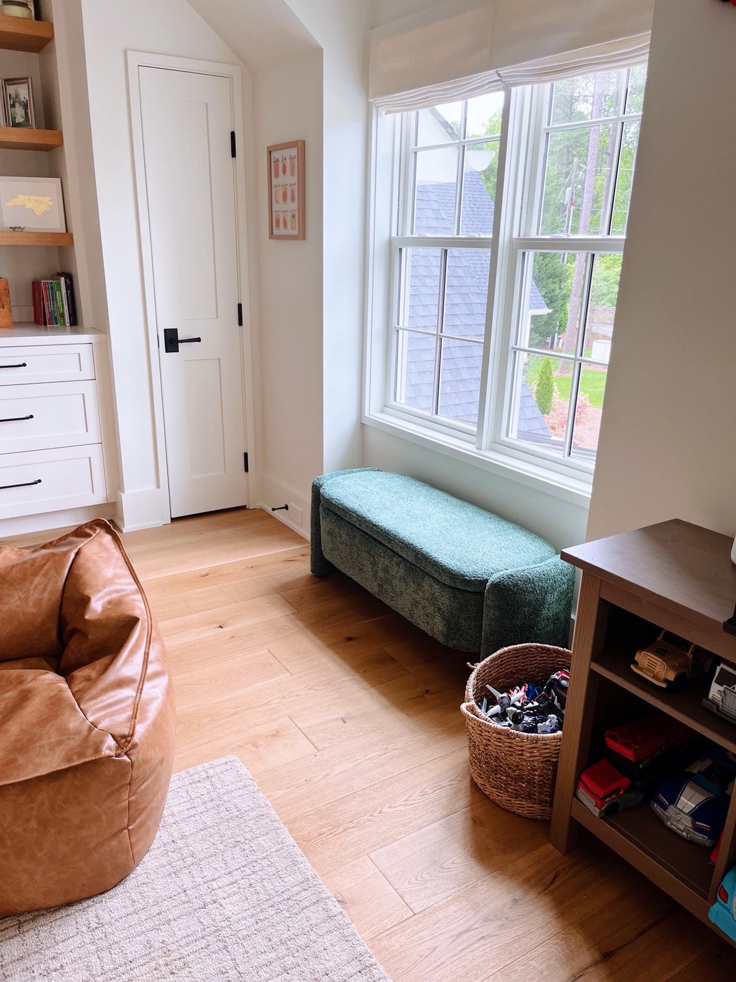 When we built our home, one of the spaces we knew would be heavily used was the open play loft space at the top of the stairs. Having never had a dedicated playroom before, we had a feeling our boys would use this space like crazy and we were right. One thing I’m glad we didn’t do? Fill up the space with furniture. We used my old IKEA office furniture on the perimeter of the room for toy storage but kept the middle of the room completely clear for play! The only things we bought for the space since we moved in were two Pottery Barn loungers (size large) and a checkered rug. I figured it was time to add a little more color to the space in a kid-friendly way and about two weeks ago, I ordered two prints off Etsy (this rainbow smiley face one and this fruit of the spirit one), framed them in Target frames and hung a felt multicolor garland above our leopard gecko’s cage to display some of the boys’ art. (I hung it using these damage-free command hooks.) Then, last week, I ordered a green storage bench for additional toy storage but also to provide another place to sit by the window in the play loft that’s not on one of the bean bags.