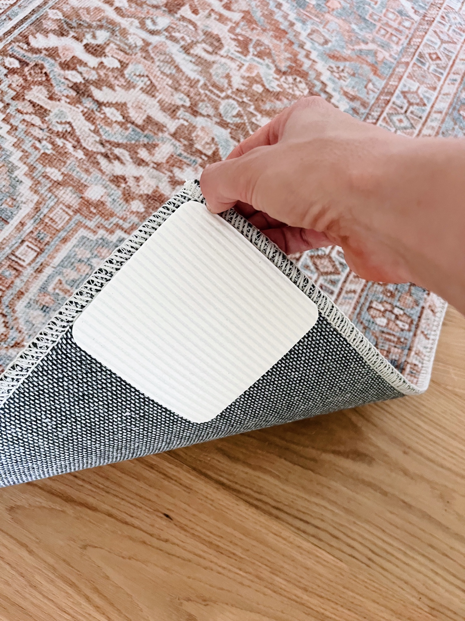 You know those little household things that bug you that you somehow live with for far too long? That was me with two of the always-moving-around rug runners in our home. The runner in our kitchen and the runner in the upstairs hallway always seemed to shift around and I’d find myself putting them back in place repeatedly throughout the day. No more! I finally found something to keep them in place that doesn’t involve permanently affixing them to our floors. Hello rug gripper pads! I bought a pack of eight of these pads off Amazon and wasn’t sure if they’d work well or not but I’ve been so impressed. They were crazy easy to use (you use peel off the back and stick them to the bottom corners of your rug) and suction well to the floor so your rug doesn’t move an inch. They’re simple and effective and now I’m just kicking myself for not ordering them sooner.