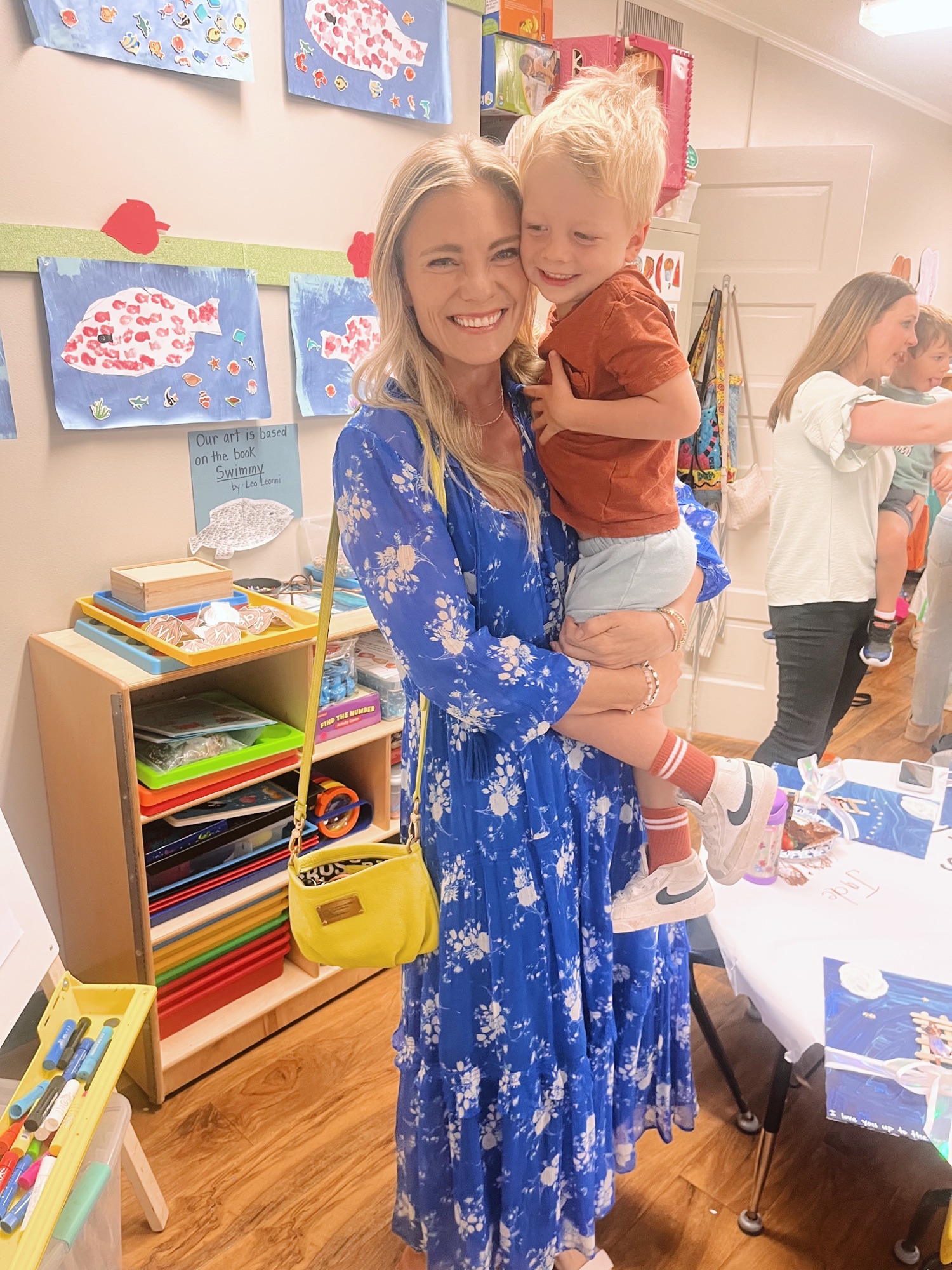 Rhett and Ryder’s preschool had their annual Muffins for Mom Mother’s Day event yesterday and it was all kinds of adorable. The boys greeted me at their classroom door, led me to a tiny chair at a tiny kid-size table and served me a gigantic blueberry muffin with strawberries on the side. They absolutely beamed throughout the whole event. As I was doing my makeup before the event, Ryder went into my closet and asked me to wear my “pretty blue dress” to be fancy for the occasion which melted me. And the fact that he drew his hair spikes on the plate he made for me — ugh my heart.