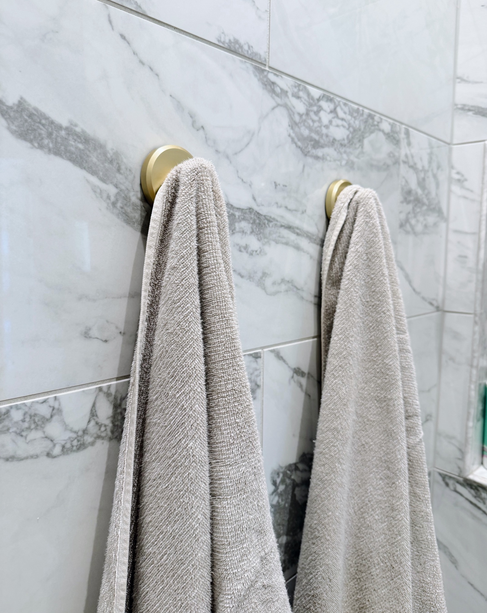 I had a feeling they would be the answer to this sweaty clothing conundrum. And after installing them in our shower last week, I’m happy to report all of Ryan’s sweaty clothing now has a place to dry in our shower before it’s ready to be washed. Oh happy day. Oh happy marriage. (And yes, I used towels on the hooks in this pic to spare you a photo of his sweaty workout clothes hanging in our shower.) A big bonus: They could not have been any easier to install and are damage-free to our shower!