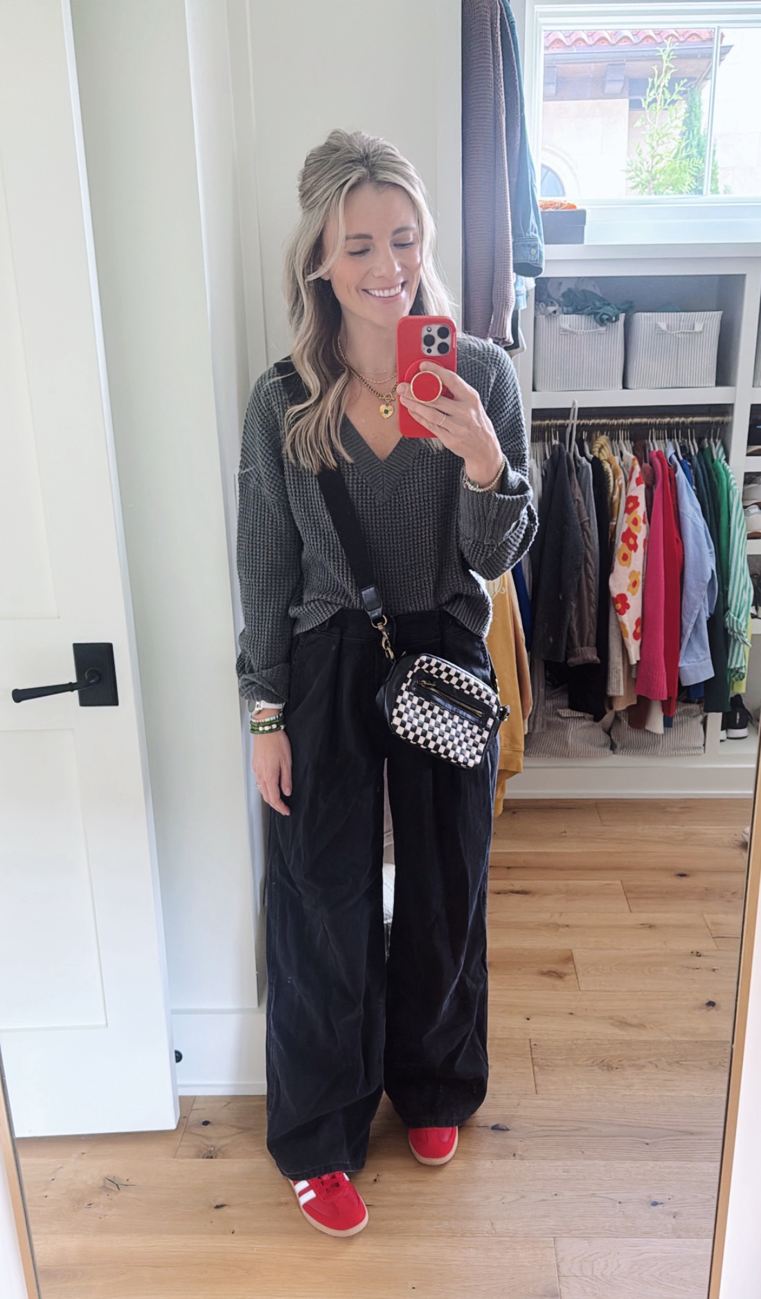(Sweater: Amazon / Pants: Target / Sneakers: Red Sambas / Bag: Target / Necklace:Amazon Heart Pendant Necklace)