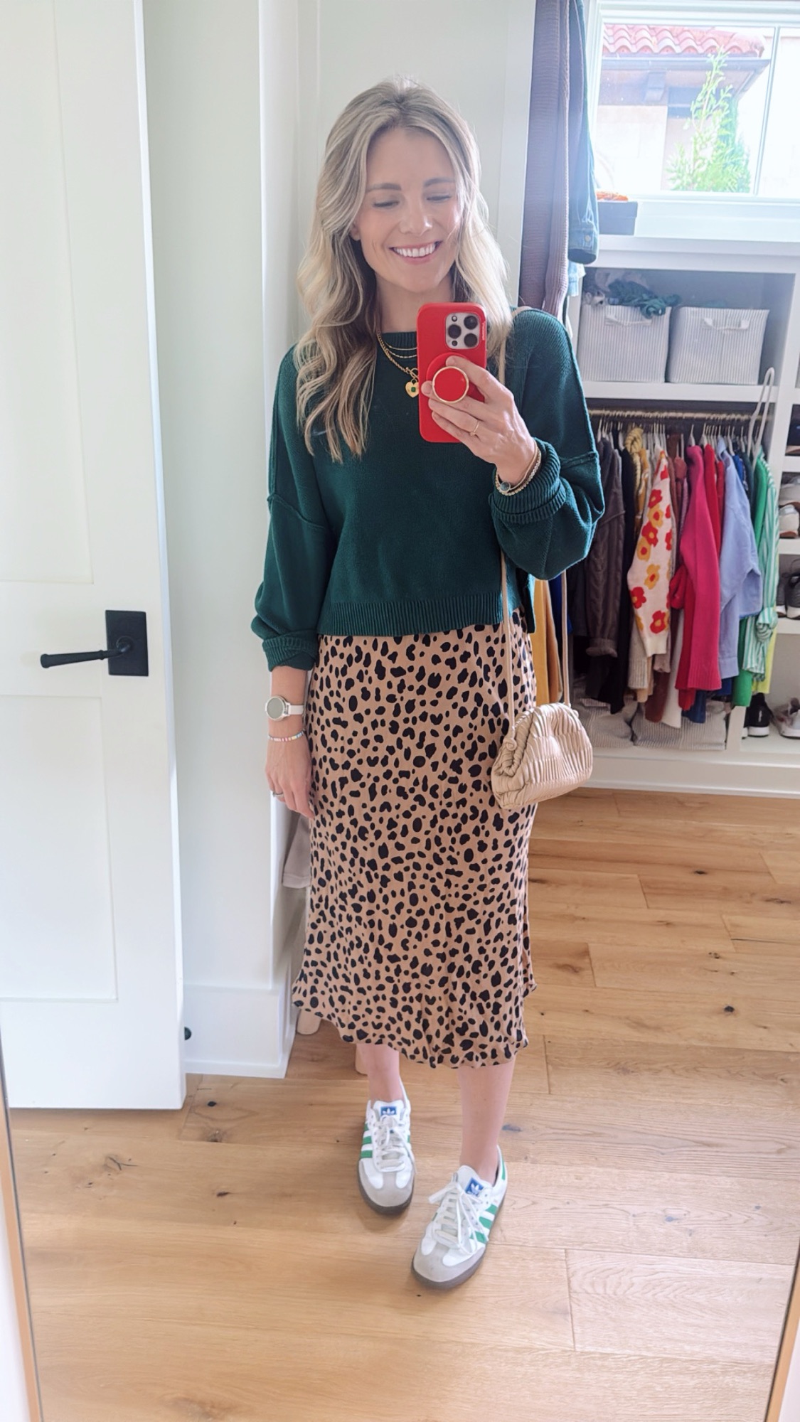 (Sweater: Amazon / Skirt: GAP but old — this one is similar / Sneakers: White + Green Sambas / Bag: Moda Luxe via StitchFix / Necklaces: Gorjana Amour Necklace + Gorjana Poppy Gem Necklace + Amazon Heart Pendant Necklace)