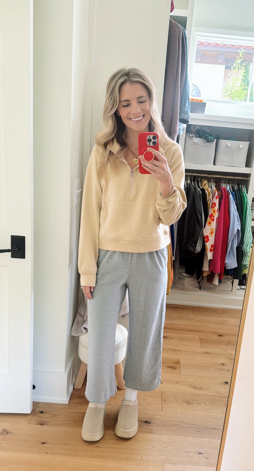 (Sweats: Hanes / Sweatshirt: Beyond Yoga / Ultra-Mini Boots: UGG)