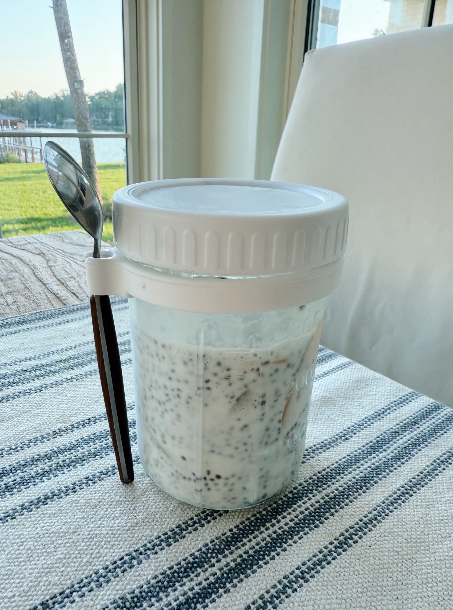 I’m all about easy breakfasts, especially now that the school year has begun. Every morning this week, I’ve had a grab-and-go chia pudding for breakfast. It’s easy, delicious and satiating, thanks to a decent amount of fiber from the chia seeds and fruit and protein from the Greek yogurt and milk. I’ve been loving these little glass jars (on sale for $8.99), as they make it super simple to prep the chia pudding and have it all ready to go with a little spoon and everything as I head out the door. I bought a two-pack and prep two at a time and its worked well for me.