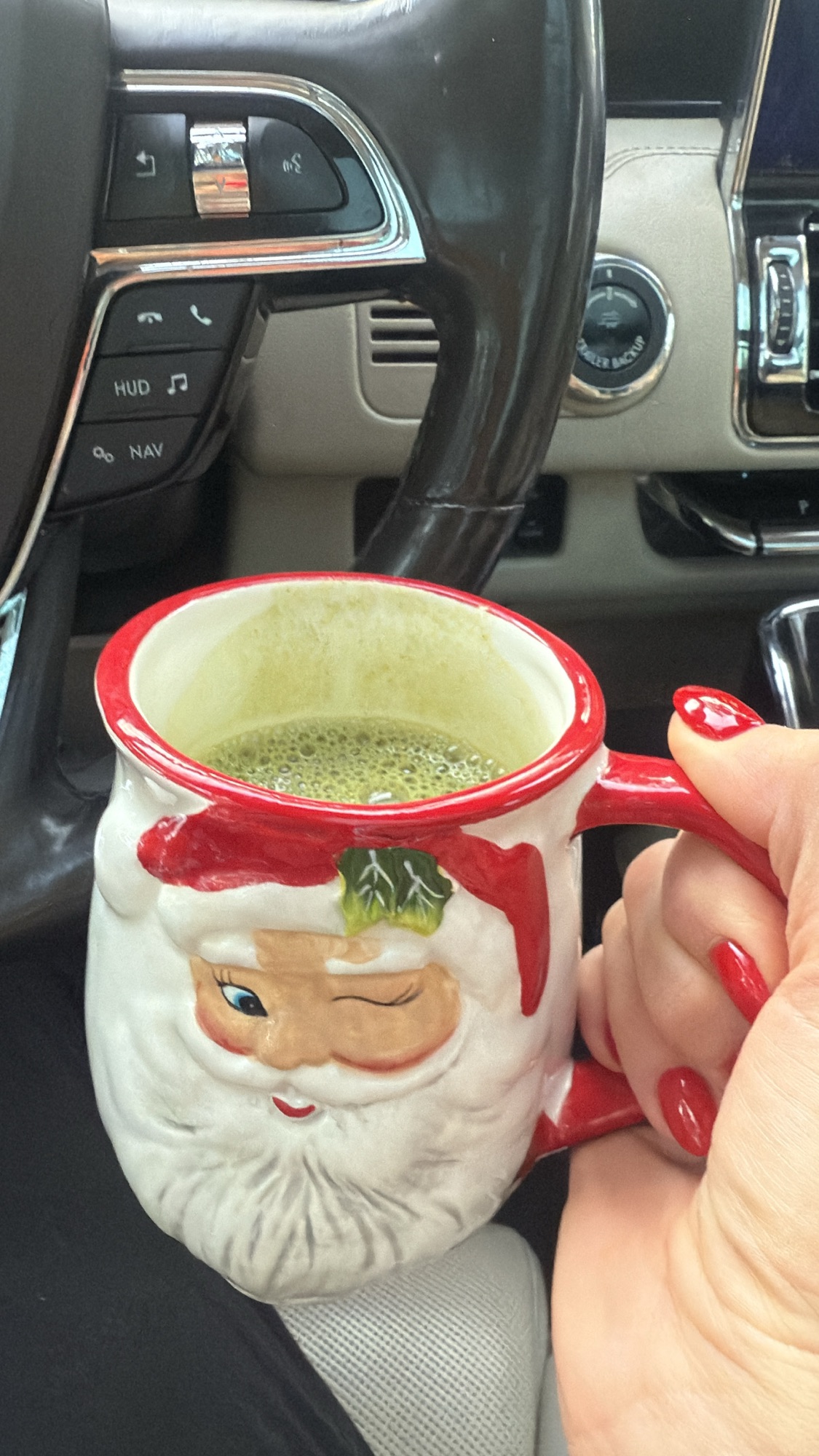 (My fav vanilla matcha protein latte in an open mug because I like to live on the wild side — JULIE15 saves 15% on the protein powder I use)