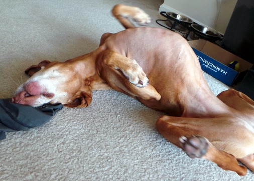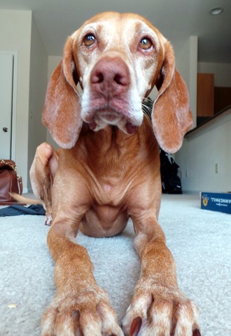 When the vet approached Sadie, she hit the deck and then wiggled around and tried to hide behind me which had everyone laughing and calling her “Slink.” She’s ridiculous.