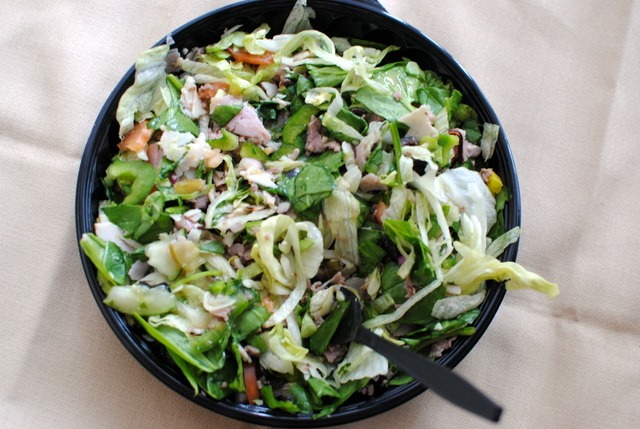 Lunch today included a Subway club salad served with a side of chocolate-covered pecans.