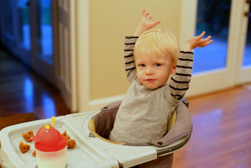 Have you thought about moving Chase to a booster seat at the table and sitting down and eating with him? My picky guy did a lot better when we did that. Now he’s almost 5 and back to only eating toast with the crust cut off, but we had a good run! 🙂