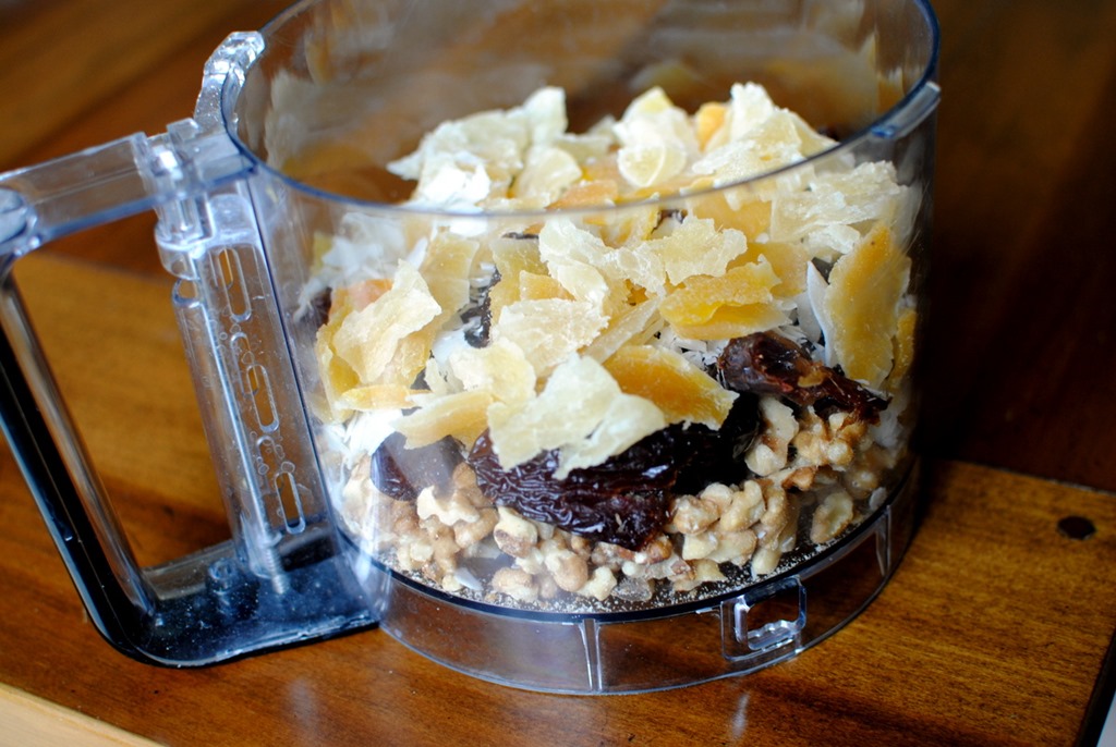 - Place all ingredients except for 1/2 cup of the coconut into a large food processor