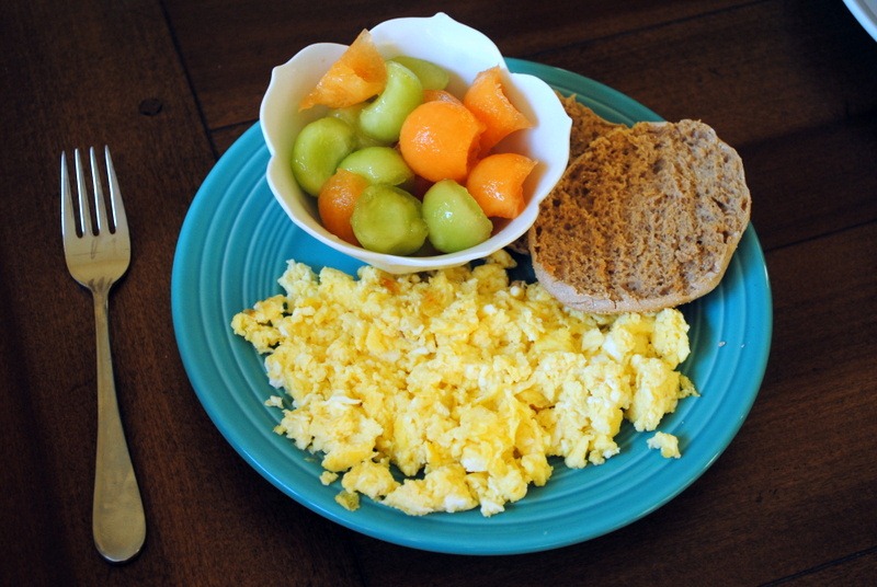 I fixed myself a plate of scrambled eggs with a splash of milk and mozzarella cheese served with the fresh fruit and a toasted whole wheat English muffin.