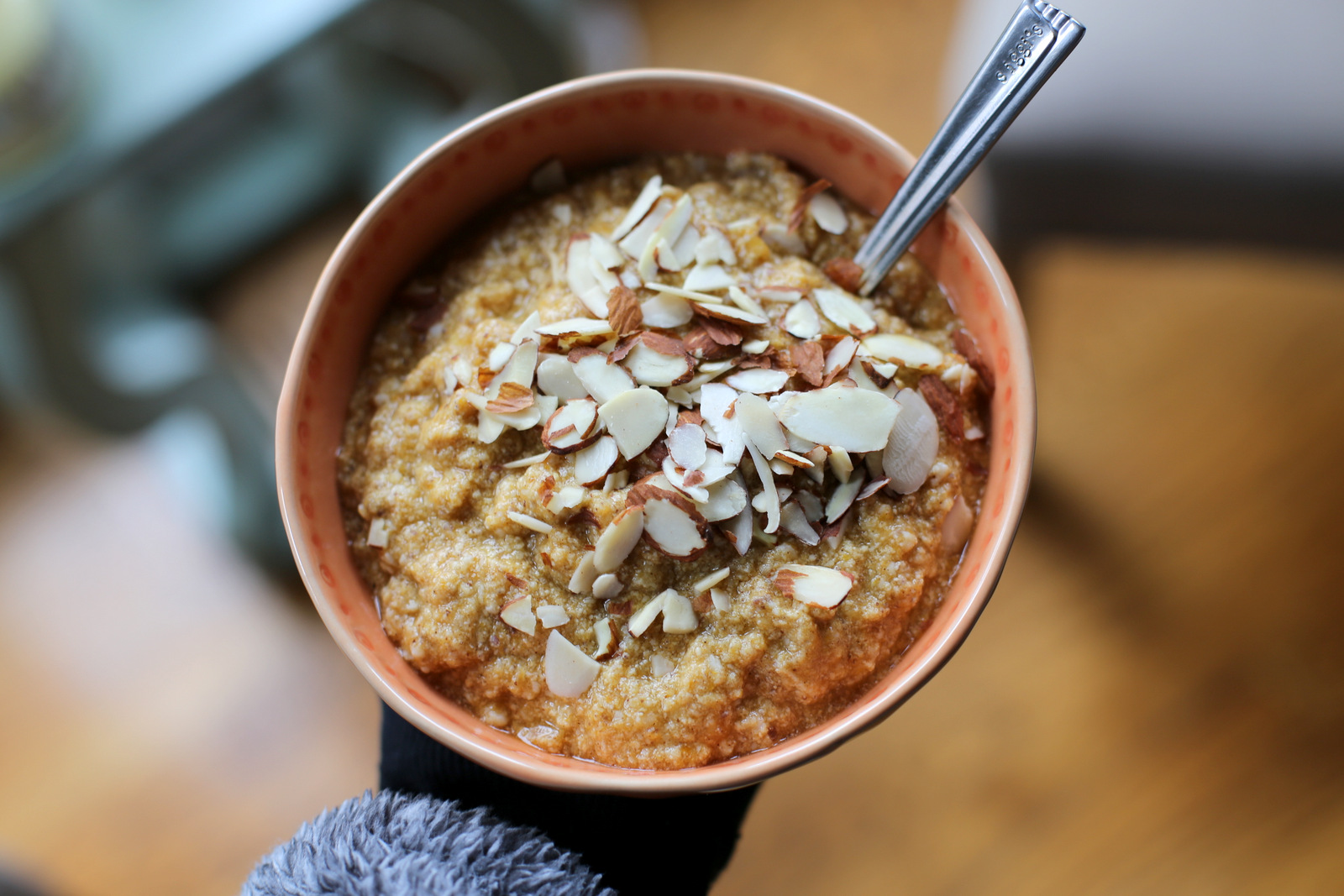 While Chase showed Ryder all of his baby toys, I made his lunch and then we headed off to preschool drop off. I debated going to the gym immediately after drop off but I could tell Ryder was ready for another nap and my stomach needed something more for breakfast than a few handfuls of granola. We headed back home and I put Ryder down for a morning nap and then made myself a big bowl of Pumpkin Paleo Oatmeal topped with sliced almonds.