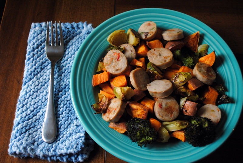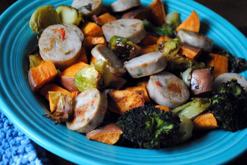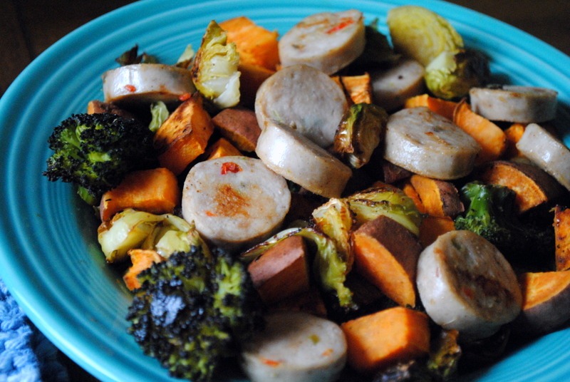 I chopped up a few al fresco chicken sausages and sautéed them on the stovetop before adding them to the roasted veggies and calling it a meal.