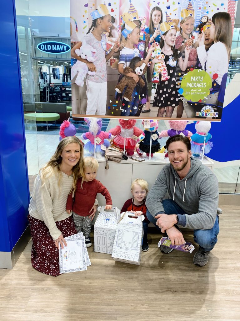 They were very into stuffing their sharks, selecting a heart for inside their matching animals, naming their sharks (both are “Mako” thanks to Chase) and printing their “birth certificates.” While I know the boys got to keep a stuffed animal out of this ordeal, something about the whole Build-a-Bear visit felt much more like an experience gift and we loved it! Plus, it was the gift that kept on giving all weekend because the boys loved decorating the cardboard box houses for their sharks on Saturday morning and carting them all over the house all weekend long.