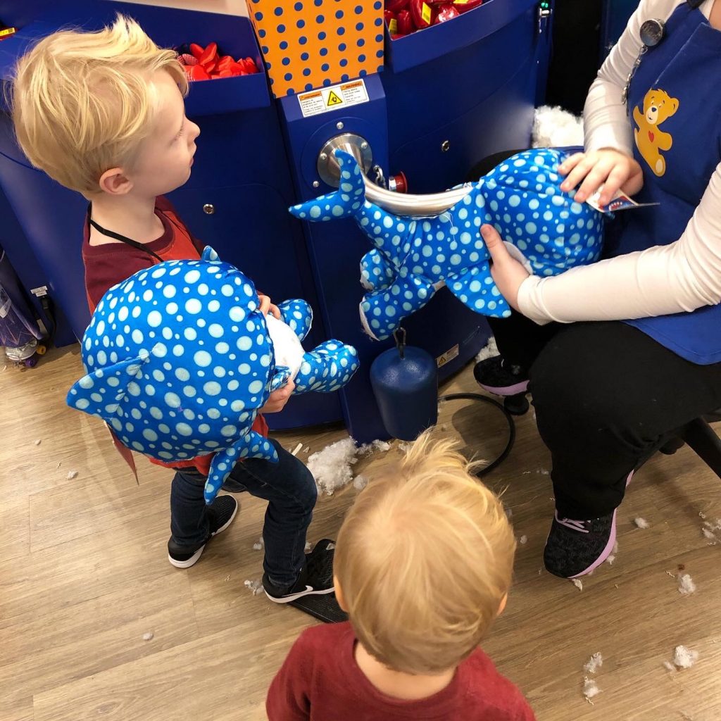 Neither Chase nor Ryder have ever been to Build-a-Bear and they were ALL about it! They ended up choosing random shark toys (Ryan and know enough by now to strongly encourage Ryder to pick the exact same toy as Chase) and both boys loved the whole process.