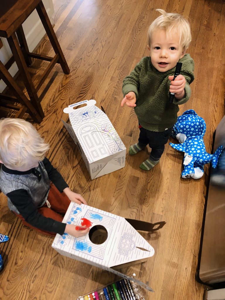(The Kwik Stix were clearly a better gift for Chase than for Ryder at this point because Ryder would have me open one for him, draw a single scribble on his shark’s box house and then immediately select another paint pen for me to open for him.)