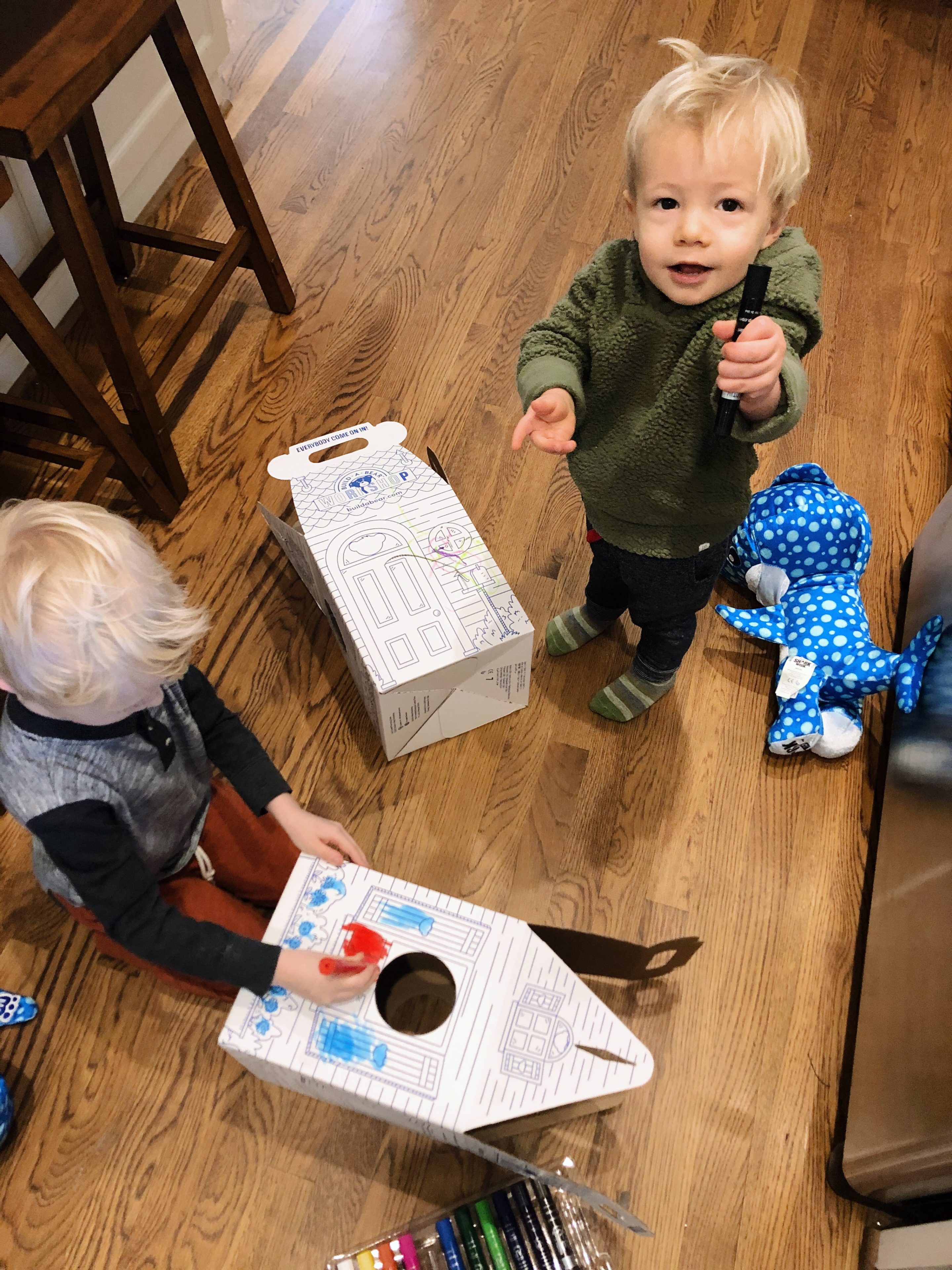 They were very into stuffing their sharks, selecting a heart for inside their matching animals, naming their sharks (both are “Mako” thanks to Chase) and printing their “birth certificates.” While I know the boys got to keep a stuffed animal out of this ordeal, something about the whole Build-a-Bear visit felt much more like an experience gift and we loved it! Plus, it was the gift that kept on giving all weekend because the boys loved decorating the cardboard box houses for their sharks on Saturday morning and carting them all over the house all weekend long.