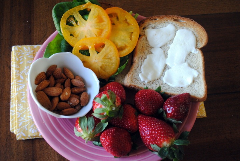 I ate the fresh mozzarella atop toasted honey wheat bread with yellow tomato slices, spinach and pesto.
