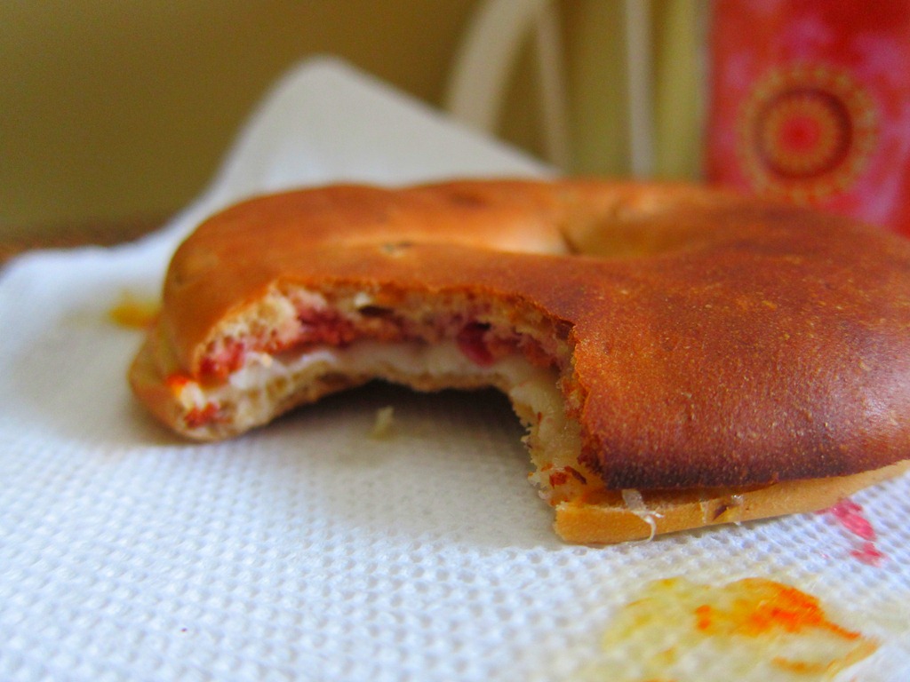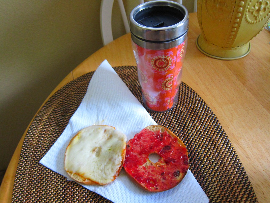 Before leaving on a massive house hunt, I made myself a bagelwich on a cinnamon raisin bagel thin with melted muenster cheese and raspberry jelly and a tumbler full of coffee to take on the road.