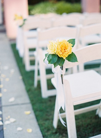 On the end of the chairs lining the aisle of our ceremony, we had a cream, soft yellow and goldstrike rose tied to together with a white satin ribbon.