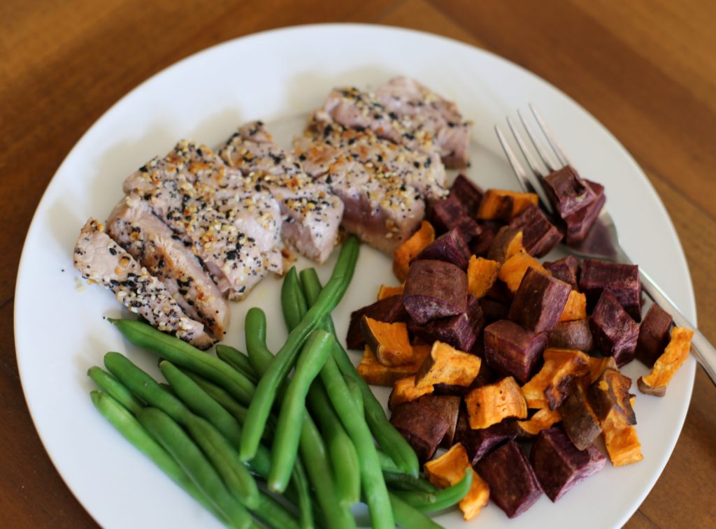 Dinner last night looked like seared tuna (I seared in in Trader Joe’s Everything But the Bagel Seasoning and it was great) paired with sweet potatoes and green beans.