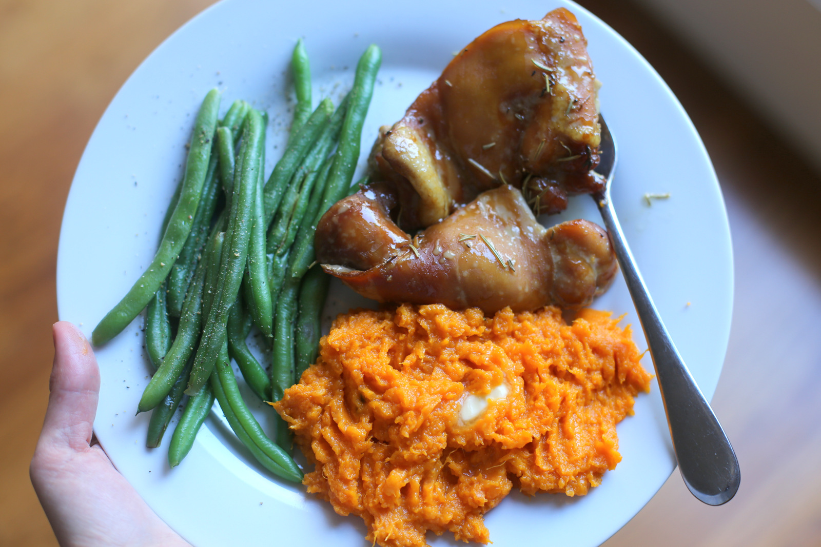 I call this an “I don’t want to think about making dinner kind of dinner,” meaning it’s the kind of dinner I can make on autopilot! I marinated a couple of pounds of chicken thighs in my favorite Paleo chicken thigh marinade and served them up with mashed sweet potatoes and green beans. Earlier in the week, I made a big batch of roasted sweet potatoes to have on hand for lunches, so the mashed sweet potatoes came together in a flash since the only thing I had to do was mash them up and add some butter and salt. We’ve been eating a lot of green beans around here as well because they’re one of the only cooked vegetables Chase loves (he oddly prefers raw vegetables over cooked veggies BIG time) which I find oddly amusing since they were my favorite vegetable as a kid.