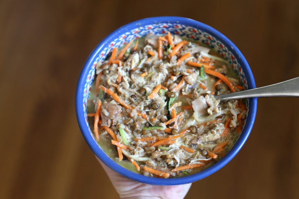 This recipe was the first one I tried from The Whole30 Slow Cooker Cookbook and we made it again last week which should tell you something about how much we loved it! If there’s one thing I love more than a tasty slow cooker recipe, it’s a slow cooker recipe that doesn’t require any chopping! (Hence why we make our fav cheesy crock pot chicken corn chili on repeat!) These Indian Chicken Noodle Bowls could not have been any easier to make and we just threw the chicken thighs into the slow cooker with spices and broth and then added coconut milk and spiralized veggies noodles (zucchini + shredded carrots) in at the end. I knew from the last time I made this recipe that it wouldn’t be overly filling the way the recipe was written, so I before serving the noodle bowls, I stirred in some spelt, green lentils and brown rice from a ready-to-heat pouch I bought from Whole Foods.