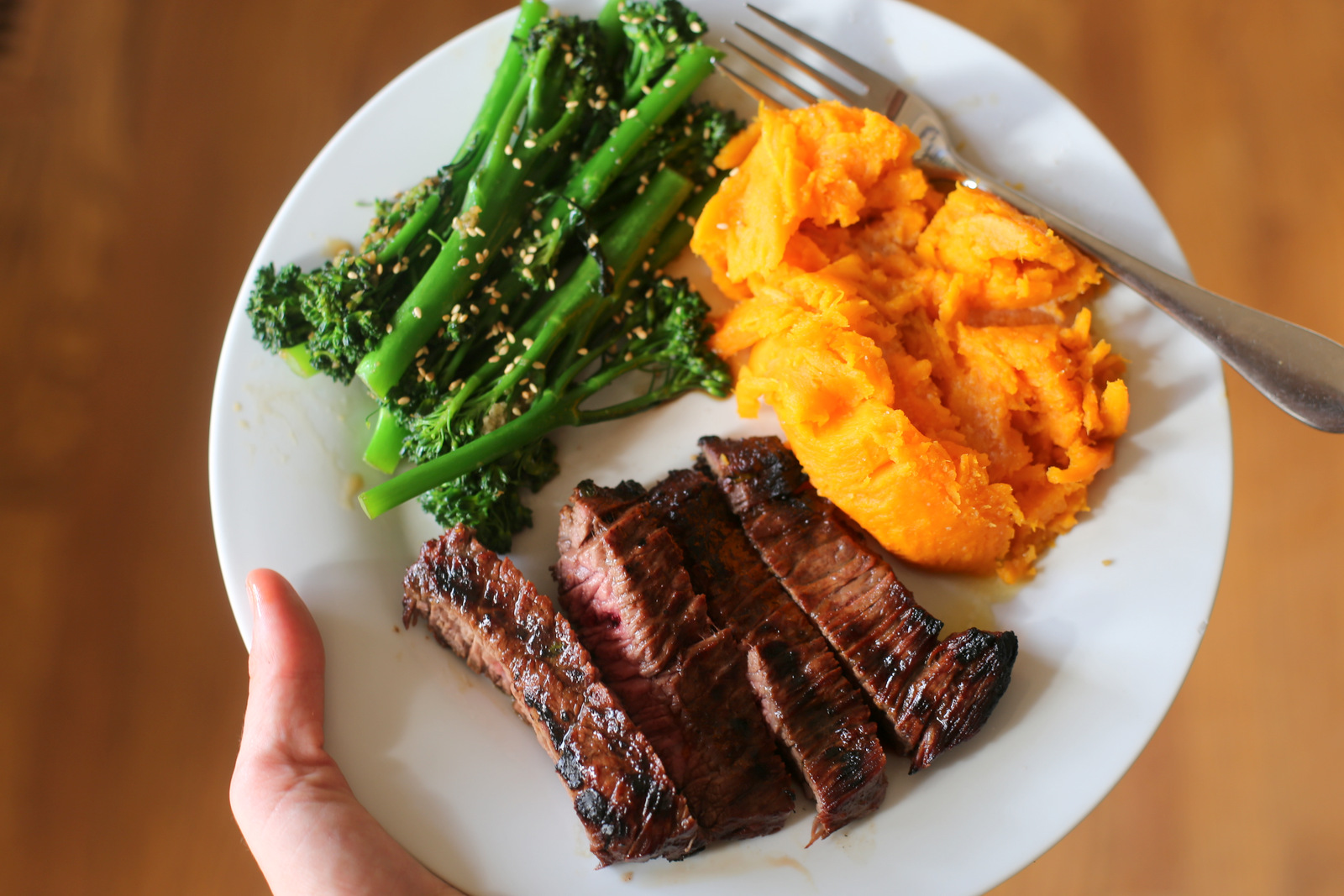 Tuesday: Grilled Skirt Steak with Ginger Sesame Broccolini and Sweet Potatoes