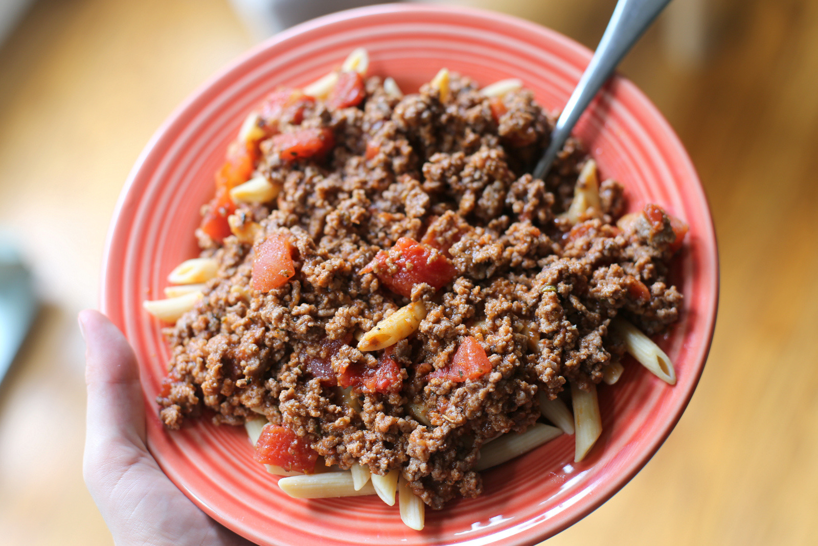 Freezer meat to the rescue again! I am loving the bulk grassfed organic ground beef from BJ’s and usually use one pack of ground beef from the three-pack before freezing the other two. I had one remaining one-pound pack of ground beef on hand in the freezer and thawed it to use in what I’ll call a super shortcut Bolognese sauce. I browned the meat before pouring a jar of store-bought marinara sauce on top and added some Italian seasoning to the mix. I then served the meat sauce over Banza chickpea pasta. This is, without a doubt, one of my go-to meals I almost always have in the back of my mind when I don’t know what to make for dinner since we almost always have some variation of the ingredients on hand in our pantry or freezer.