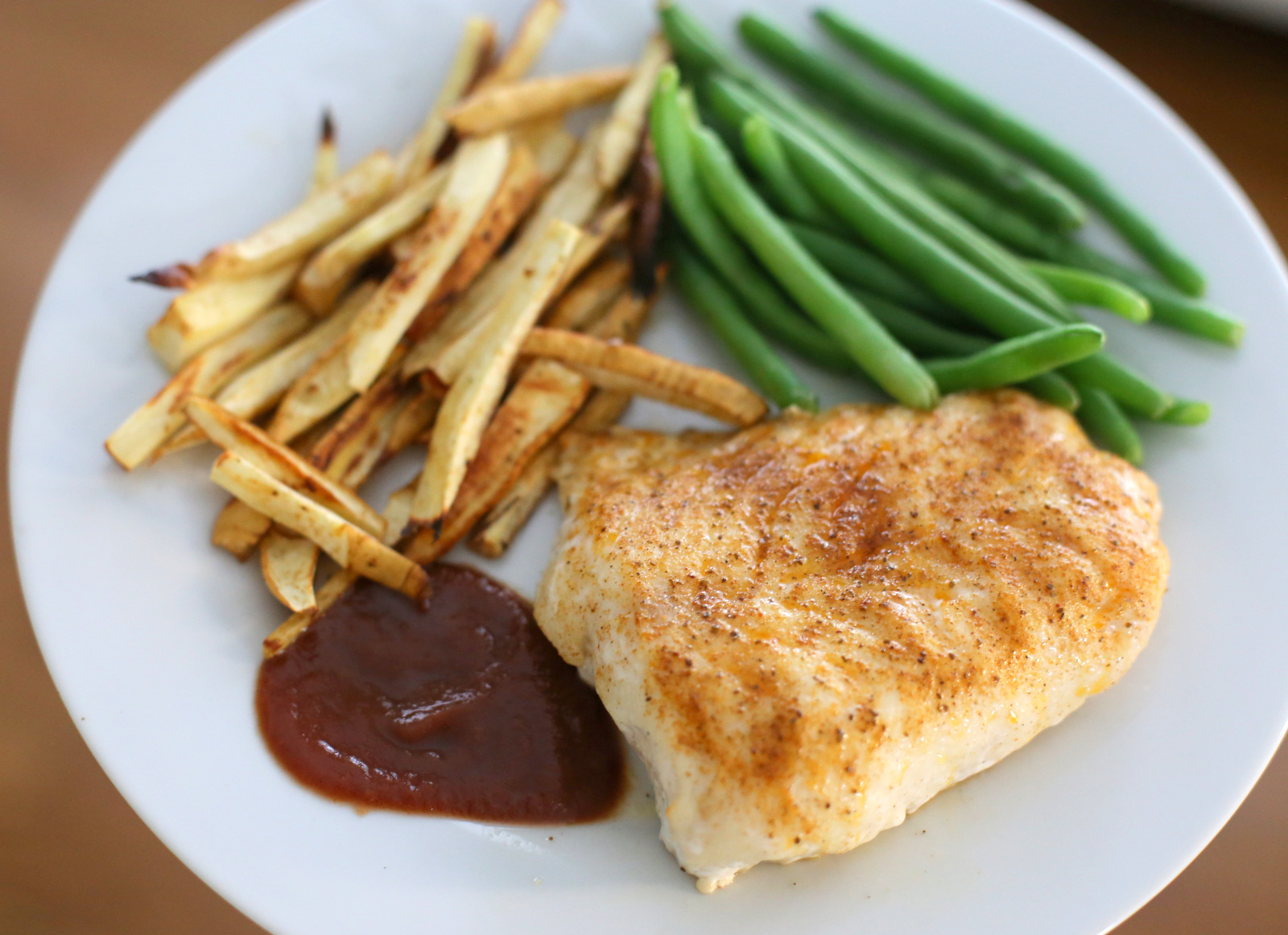 You guys already saw this dinner if you checked out the blog last week but it was a good one! Since I didn’t meal plan at all last week, I grabbed a bunch of veggies at the grocery store and relied mostly on pantry staples and our freezer stash for the “meat” of our meals. I defrosted a couple of grouper filets, rubbed them with olive oil and baked them in the oven with a bit of Old Bay seasoning. For our sides, I made parsnip fries (slice parsnips, toss in olive oil, season with seasoned salt and roast) and steamed green beans. It was a simple meal but delicious!