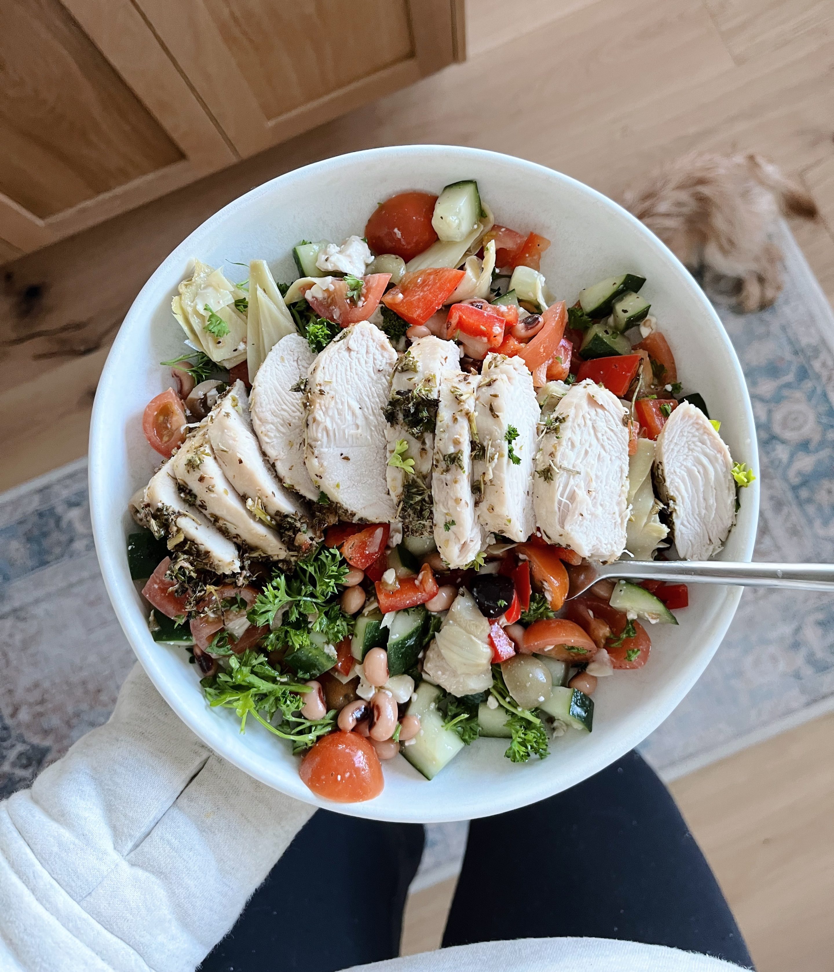 This chopped salad was what fresh and nutrient-dense dreams are made of and the only reason it happened was because I meal planned. If you think I would’ve taken the time to chop up all that stuff at the end of the day when things feel chaotic, you’re sorely mistaken! Instead I chopped up all the veggies after I picked up Ryder from preschool and he and Rhett were entertaining each other in the early afternoon. Having all the veggies ready made the rest of the meal a breeze! In the salad: Chopped tomatoes, olives, cucumber, red bell pepper, artichokes, fresh parsley, black-eyed peas (random, I know) and feta cheese. I tossed it all with bottled balsamic dressing we had in the fridge and sliced chicken breasts. (I marinated the chicken breasts in a combination of olive oil, lemon juice, salt, pepper, rosemary, oregano and garlic powder and baked them at 350-degrees until they were cooked through.) Also, I titled this meal Greek-inspired chopped salad because that’s what it seemed like to me but I really have no idea what it should be called because the ingredients were all over the place. It was a winner though!