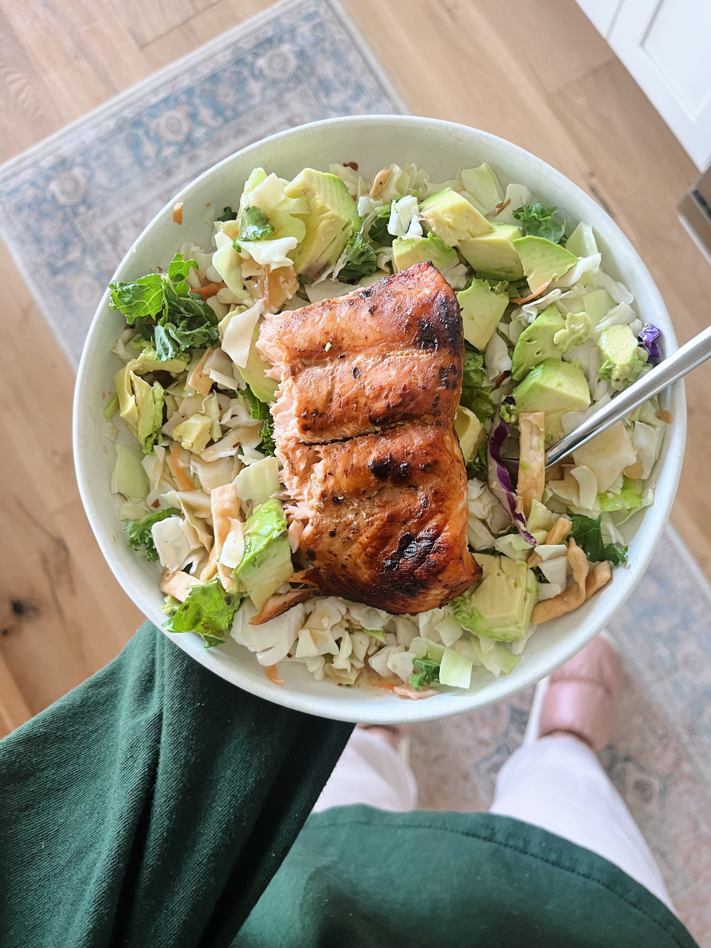 Ryan had a work event on Wednesday night and usually on his work dinner nights I’ll do something like breakfast for dinner for myself or even oatmeal but I planned to make a salmon salad for myself when I did my meal planning and that actually sounded delicious! Another win for meal planning! I prepared the salmon in the air fryer and placed it on top of a bagged chopped Asian salad mix along with avocado. Simple and tasty!