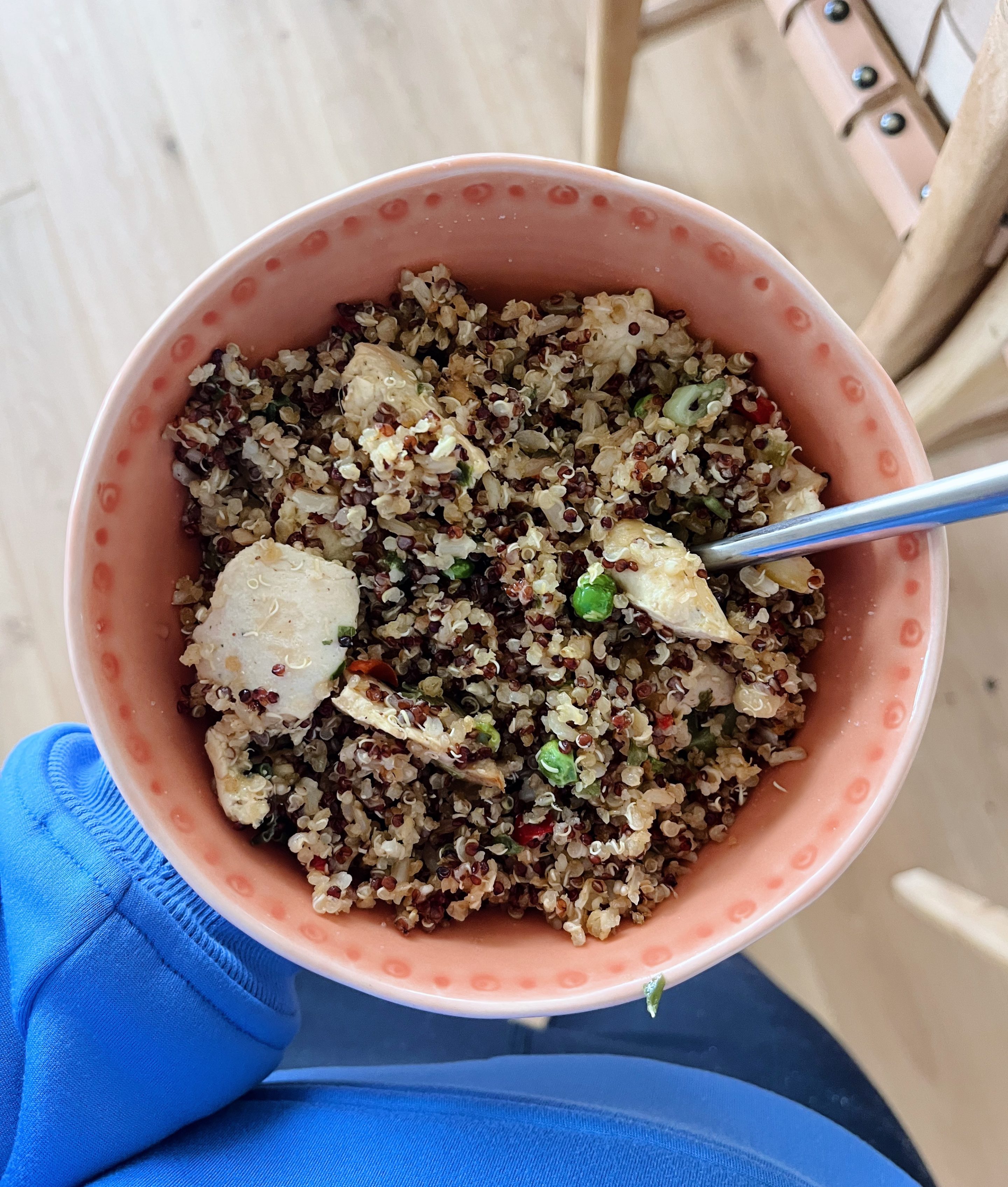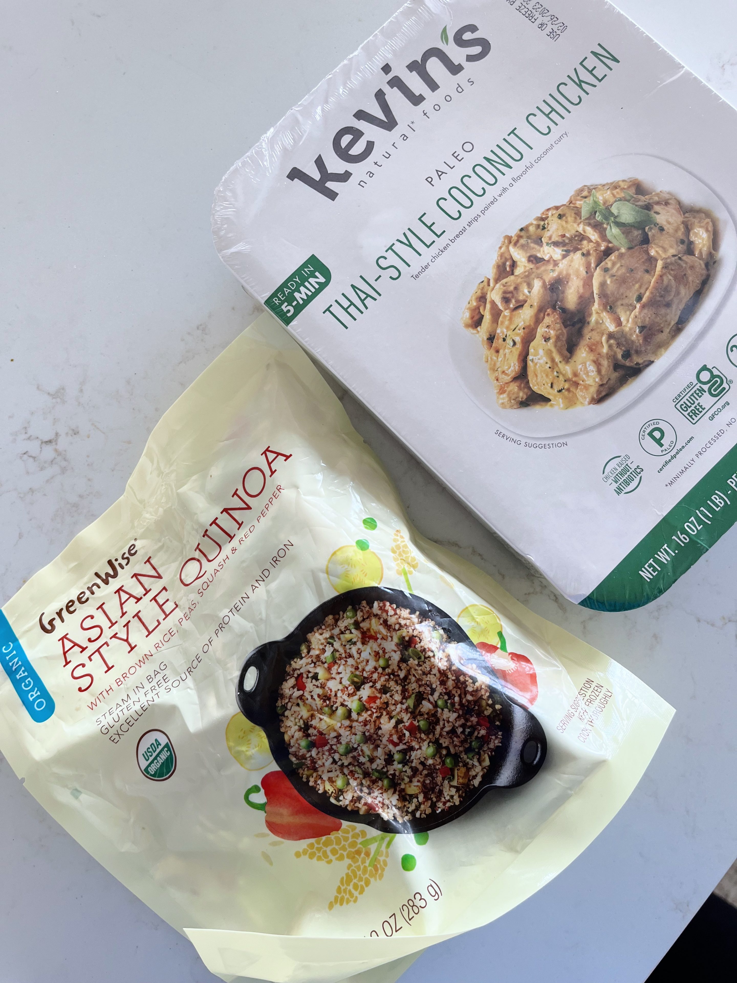 This meal was semi-homemade thanks to a few shortcuts. I first prepared Kevin’s Thai-Style Coconut Chicken in a skillet. (Worth noting: We’ve made Kevin’s chicken meals in the past and preparing it on the stovetop vs. in the microwave is the way to go!) I then added a frozen Asian quinoa mix I bought from Publix that included brown rice, bell pepper, peas and squash. Gotta love a super-easy dinner!